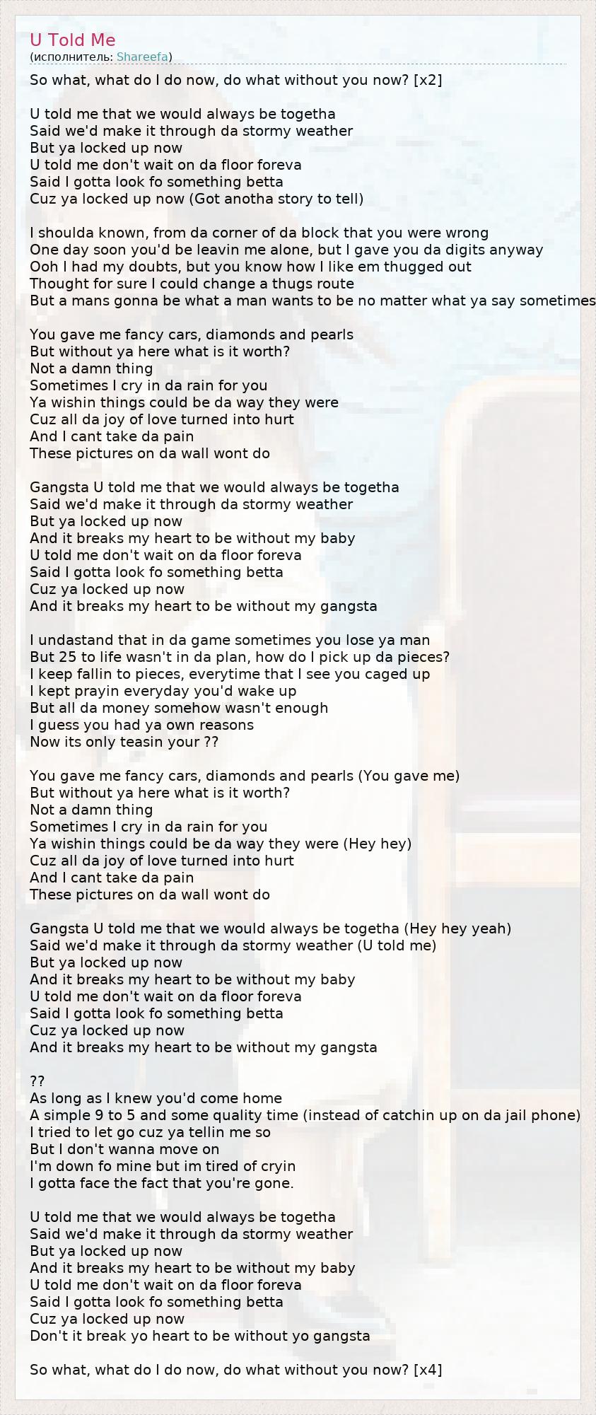 So what, what do I do now, do what without you now? [x2] U told me that we would always be togetha Said we'd make it through da stormy weather But ya locked up now U told me don't wait on da floor foreva Said I gotta look fo something betta Cuz ya locked up now (Got anotha story to tell) I shoulda known, from da corner of da block that you were wrong One day soon you'd be leavin me alone, but I gave you da digits anyway Ooh I had my doubts, but you know how I like em thugged out Thought for sure I could change a thugs route But a mans gonna be what a man wants to be no matter what ya say sometimes You gave me fancy cars, diamonds and pearls But without ya here what is it worth? Not a damn thing Sometimes I cry in da rain for you Ya wishin things could be da way they were Cuz all da joy of love turned into hurt And I cant take da pain These pictures on da wall wont do Gangsta U told me that we would always be togetha Said we'd make it through da stormy weather But ya locked up now And it breaks my heart to be without my baby U told me don't wait on da floor foreva Said I gotta look fo something betta Cuz ya locked up now And it breaks my heart to be without my gangsta I undastand that in da game sometimes you lose ya man But 25 to life wasn't in da plan, how do I pick up da pieces? I keep fallin to pieces, everytime that I see you caged up I kept prayin everyday you'd wake up But all da money somehow wasn't enough I guess you had ya own reasons Now its only teasin your ?? You gave me fancy cars, diamonds and pearls (You gave me) But without ya here what is it worth? Not a damn thing Sometimes I cry in da rain for you Ya wishin things could be da way they were (Hey hey) Cuz all da joy of love turned into hurt And I cant take da pain These pictures on da wall wont do Gangsta U told me that we would always be togetha (Hey hey yeah) Said we'd make it through da stormy weather (U told me) But ya locked up now And it breaks my heart to be without my baby U told me don't wait on da floor foreva Said I gotta look fo something betta Cuz ya locked up now And it breaks my heart to be without my gangsta ?? As long as I knew you'd come home A simple 9 to 5 and some quality time (instead of catchin up on da jail phone) I tried to let go cuz ya tellin me so But I don't wanna move on I'm down fo mine but im tired of cryin I gotta face the fact that you're gone. U told me that we would always be togetha Said we'd make it through da stormy weather But ya locked up now And it breaks my heart to be without my baby U told me don't wait on da floor foreva Said I gotta look fo something betta Cuz ya locked up now Don't it break yo heart to be without yo gangsta So what, what do I do now, do what without you now? [x4]