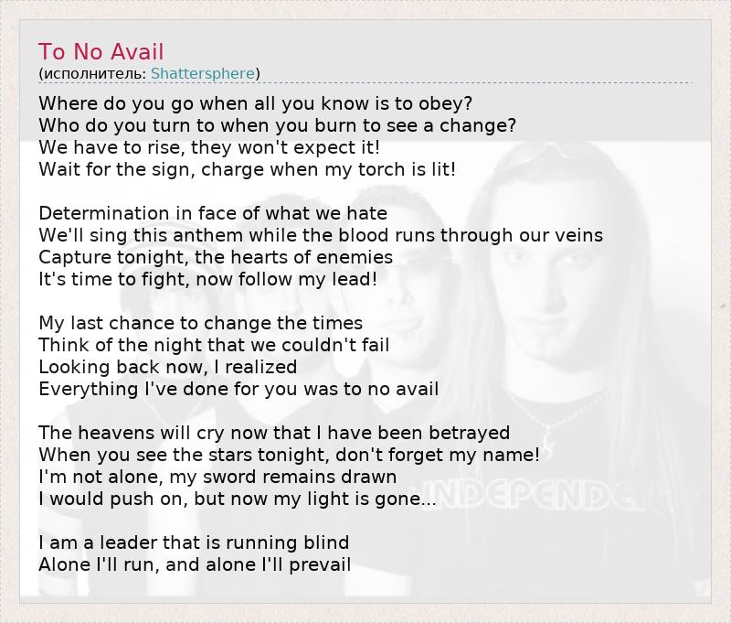 Where do you go when all you know is to obey? Who do you turn to when you burn to see a change? We have to rise, they won't expect it! Wait for the sign, charge when my torch is lit! Determination in face of what we hate We'll sing this anthem while the blood runs through our veins Capture tonight, the hearts of enemies It's time to fight, now follow my lead! My last chance to change the times Think of the night that we couldn't fail Looking back now, I realized Everything I've done for you was to no avail The heavens will cry now that I have been betrayed When you see the stars tonight, don't forget my name! I'm not alone, my sword remains drawn I would push on, but now my light is gone... I am a leader that is running blind Alone I'll run, and alone I'll prevail