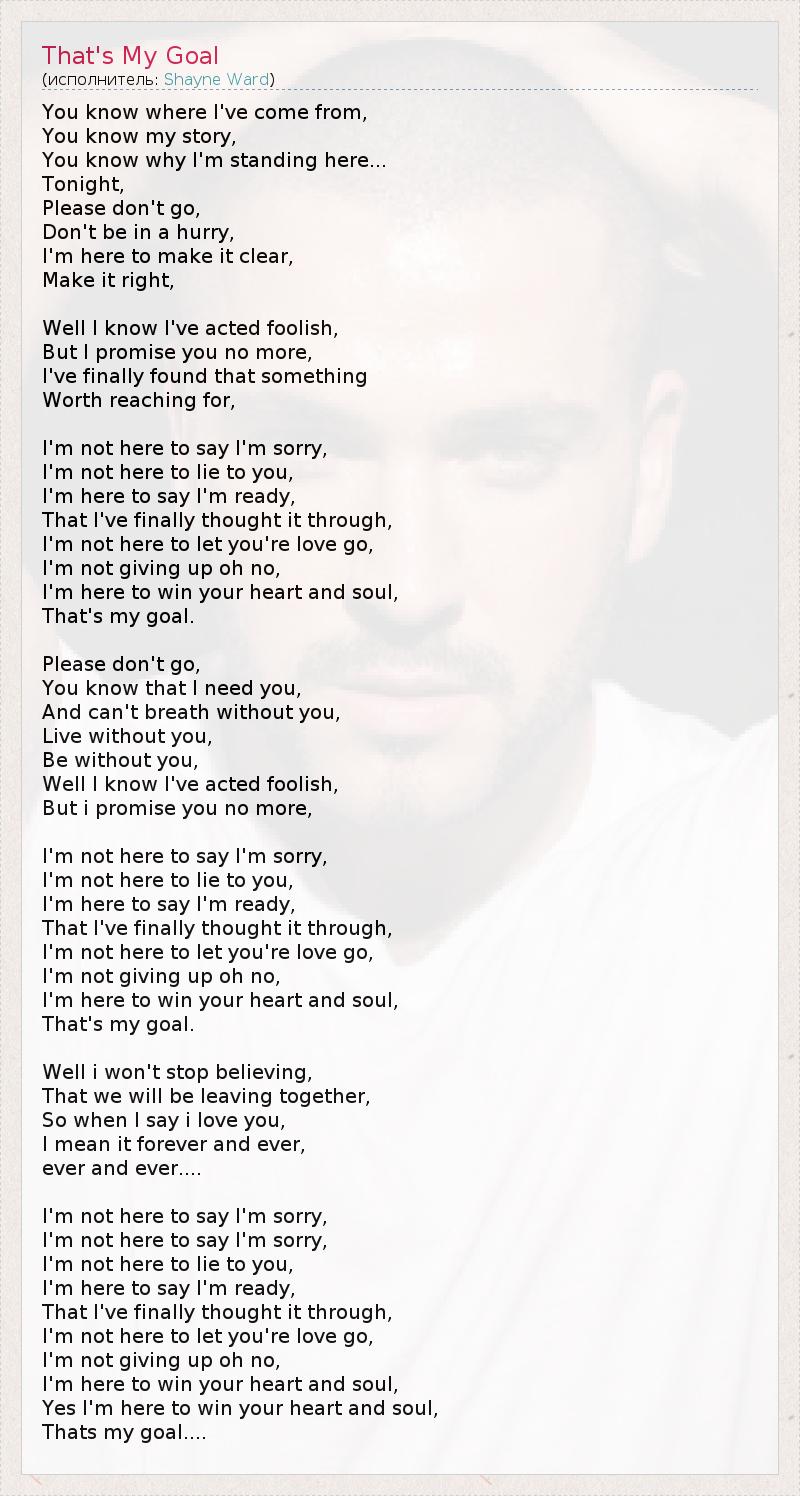 Это интересно:Шейн Уорд (англ. Shayne Thomas Ward, р. 16 октября 1984 в Манчестере, Англия) — английский поп-исполнитель, который заслужил славу в качестве победителя второго сезона «The X Factor». Его первый сингл «That's My Goal» вышел в Великобритании в среду 21 декабря 2005 года и стал рождественским синглом номер один в Великобритании. В первые дни было продано 313 000 копий композиции, что сделало её третьим синглом... продолжение