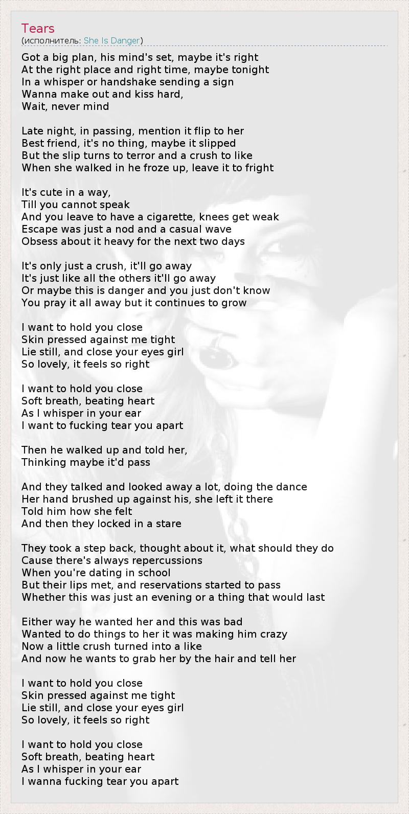 В голове есть план, он всё решил, может, это и верно, В нужном месте и в нужное время, может, сегодня Сделать намек, шепотом или пожав руку, Что хочет подружиться и крепко поцеловать, Стой, не бери в голову. Поздно ночью он случайно обмолвился об этом ее лучшей подруге, Нет, это ничего не значит, просто вырвалось. Но эта обмолвка вызывает в нем ужас и желание понравиться. Когда она вошла, он застыл от страха. В какой-то степени это даже интересно, Пока ты не можешь и слова сказать, И ты идешь за сигаретой, а ноги подкашиваются. Спасением был лишь кивок и непроизвольный жест рукой. А потом воспоминания об этом преследуют тебя в течение двух дней. Это всего лишь влечение, это пройдет, Это как обычно, это пройдет, Или может это опасно, а ты и не знаешь, Ты молишься, чтобы это ушло, но чувство только нарастает. Я хочу тебя прижать к себе, Кожа касается моей. Лежи тихо, и закрой глаза, девочка, Так приятно, как же это хорошо. Я хочу тебя прижать к себе. Нежное дыхание, быстро бьется сердце, Когда я шепчу тебе на ухо: "Я чертовски хочу разорвать тебя на куски!" Потом он подошел к ней и заговорил, Надеясь, что, может, это пройдет. И, танцуя, они говорили и постоянно отводили взгляд. Ее рука случайно задела его, и она не убрала ее, Она сказала, что чувствовала, После они пристально посмотрели друг на друга. Сделали шаг назад, думая о том, что им теперь делать, Потому что, если встречаешься с кем-то из школы, Всегда будут последствия. Но их губы встретились, и вес сомнения стал уходить, Без разницы, будет ли это только на вечер или нечто большее. В любом случае, он хотел ее и это плохо, Хотел сделать это с ней, и это сводило ее с ума. Теперь просто к желанию прибавилась сильная симпатия, И сейчас он хочет схватить ее за волосы и сказать: Я хочу тебя прижать к себе, Кожа касается моей. Лежи тихо, и закрой глаза, девочка, Так приятно, как же это хорошо. Я хочу тебя прижать к себе. Нежное дыхание, быстро бьется сердце, Когда я шепчу тебе на ухо: "Я чертовски хочу разорвать тебя на куски!"
