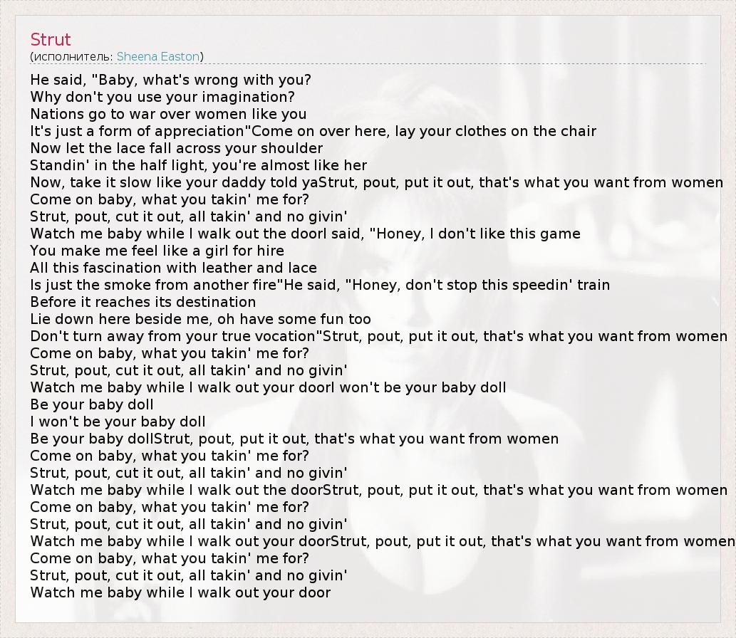 Watch me baby while I walk out the doorStrut, pout, put it out, that's what you want from women