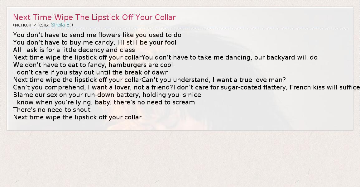 You don't have to send me flowers like you used to do You don't have to buy me candy, I'll still be your fool All I ask is for a little decency and class Next time wipe the lipstick off your collarYou don't have to take me dancing, our backyard will do We don't have to eat to fancy, hamburgers are cool I don't care if you stay out until the break of dawn Next time wipe the lipstick off your collarCan't you understand, I want a true love man? Can't you comprehend, I want a lover, not a friend?I don't care for sugar-coated flattery, French kiss will suffice Blame our sex on your run-down battery, holding you is nice I know when you're lying, baby, there's no need to scream There's no need to shout Next time wipe the lipstick off your collar