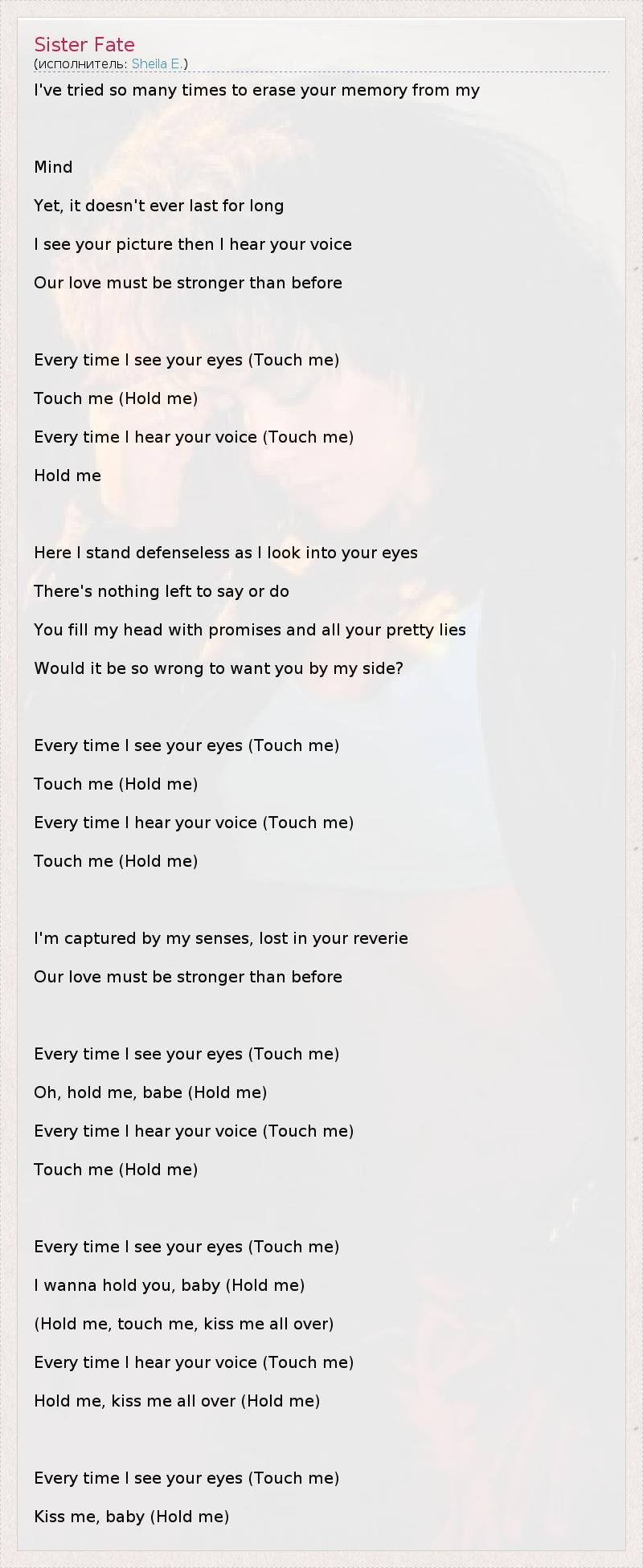 I've tried so many times to erase your memory from my Mind Yet, it doesn't ever last for long I see your picture then I hear your voice Our love must be stronger than before Every time I see your eyes (Touch me) Touch me (Hold me) Every time I hear your voice (Touch me) Hold me Here I stand defenseless as I look into your eyes There's nothing left to say or do You fill my head with promises and all your pretty lies Would it be so wrong to want you by my side? Every time I see your eyes (Touch me) Touch me (Hold me) Every time I hear your voice (Touch me) Touch me (Hold me) I'm captured by my senses, lost in your reverie Our love must be stronger than before Every time I see your eyes (Touch me) Oh, hold me, babe (Hold me) Every time I hear your voice (Touch me) Touch me (Hold me) Every time I see your eyes (Touch me) I wanna hold you, baby (Hold me) (Hold me, touch me, kiss me all over) Every time I hear your voice (Touch me) Hold me, kiss me all over (Hold me) Every time I see your eyes (Touch me) Kiss me, baby (Hold me)