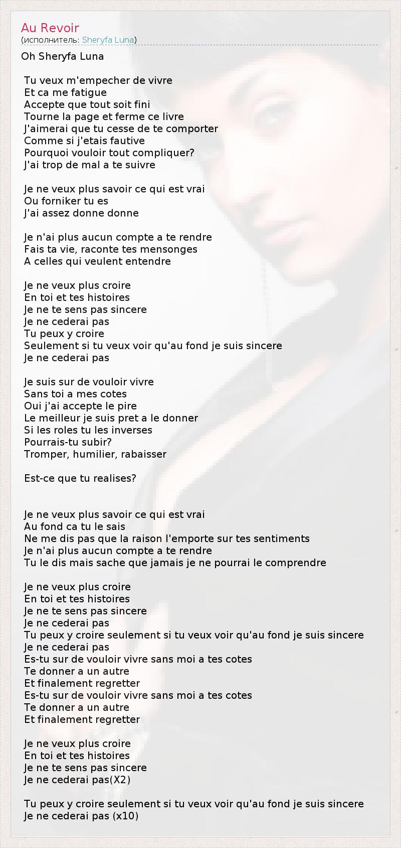 Oh Sheryfa Luna Tu veux m'empecher de vivre Et ca me fatigue Accepte que tout soit fini Tourne la page et ferme ce livre J'aimerai que tu cesse de te comporter Comme si j'etais fautive Pourquoi vouloir tout compliquer? J'ai trop de mal a te suivre Je ne veux plus savoir ce qui est vrai Ou forniker tu es J'ai assez donne donne Je n'ai plus aucun compte a te rendre Fais ta vie, raconte tes mensonges A celles qui veulent entendre Je ne veux plus croire En toi et tes histoires Je ne te sens pas sincere Je ne cederai pas Tu peux y croire Seulement si tu veux voir qu'au fond je suis sincere Je ne cederai pas Je suis sur de vouloir vivre Sans toi a mes cotes Oui j'ai accepte le pire Le meilleur je suis pret a le donner Si les roles tu les inverses Pourrais-tu subir? Tromper, humilier, rabaisser Est-ce que tu realises? Je ne veux plus savoir ce qui est vrai Au fond ca tu le sais Ne me dis pas que la raison l'emporte sur tes sentiments Je n'ai plus aucun compte a te rendre Tu le dis mais sache que jamais je ne pourrai le comprendre Je ne veux plus croire En toi et tes histoires Je ne te sens pas sincere Je ne cederai pas Tu peux y croire seulement si tu veux voir qu'au fond je suis sincere Je ne cederai pas Es-tu sur de vouloir vivre sans moi a tes cotes Te donner a un autre Et finalement regretter Es-tu sur de vouloir vivre sans moi a tes cotes Te donner a un autre Et finalement regretter Je ne veux plus croire En toi et tes histoires Je ne te sens pas sincere Je ne cederai pas(X2) Tu peux y croire seulement si tu veux voir qu'au fond je suis sincere Je ne cederai pas (x10)