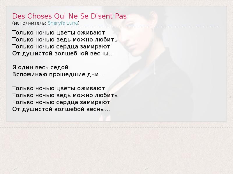 Только ночью цветы оживают Только ночью ведь можно любить Только ночью сердца замирают От душистой волшебной весны... Я один весь седой Вспоминаю прошедшие дни... Только ночью цветы оживают Только ночью ведь можно любить Только ночью сердца замирают От душистой волшебой весны...