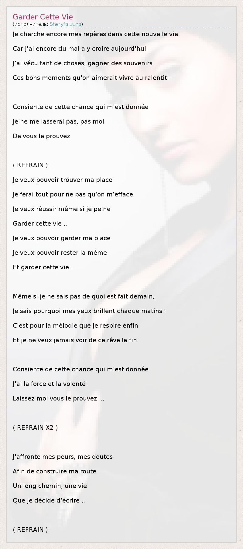 А как ты думаешь, о чем песня "Garder Cette Vie" ?