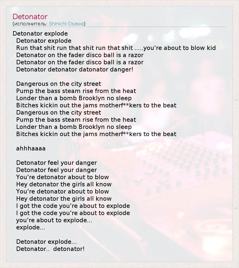 Detonator explode Detonator explode Run that shit run that shit run that shit .....you're about to blow kid Detonator on the fader disco ball is a razor Detonator on the fader disco ball is a razor Detonator detonator datonator danger! Dangerous on the city street Pump the bass steam rise from the heat Londer than a bomb Brooklyn no sleep Bitches kickin out the jams motherf**kers to the beat Dangerous on the city street Pump the bass steam rise from the heat Londer than a bomb Brooklyn no sleep Bitches kickin out the jams motherf**kers to the beat ahhhaaaa Detonator feel your danger Detonator feel your danger You're detonator about to blow Hey detonator the girls all know You're detonator about to blow Hey detonator the girls all know I got the code you're about to explode I got the code you're about to explode you're about to explode... explode... Detonator explode... Detonator.. detonator!