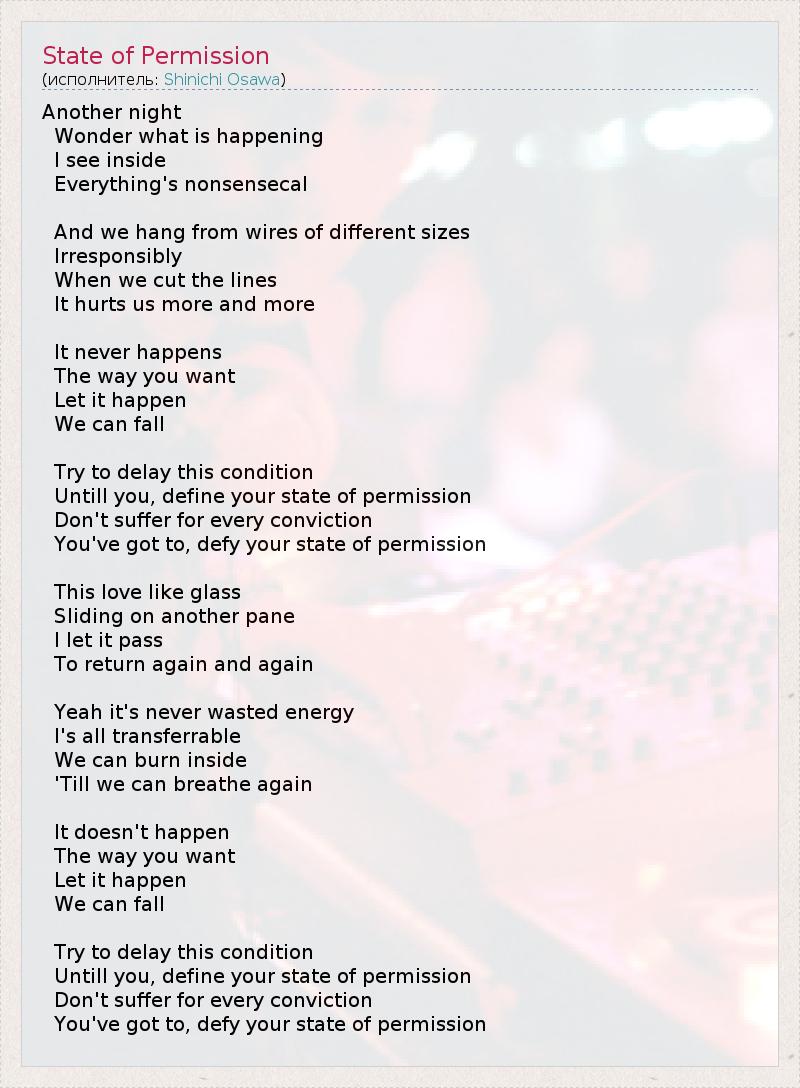 Another night Wonder what is happening I see inside Everything's nonsensecal And we hang from wires of different sizes Irresponsibly When we cut the lines It hurts us more and more It never happens The way you want Let it happen We can fall Try to delay this condition Untill you, define your state of permission Don't suffer for every conviction You've got to, defy your state of permission This love like glass Sliding on another pane I let it pass To return again and again Yeah it's never wasted energy I's all transferrable We can burn inside 'Till we can breathe again It doesn't happen The way you want Let it happen We can fall Try to delay this condition Untill you, define your state of permission Don't suffer for every conviction You've got to, defy your state of permission