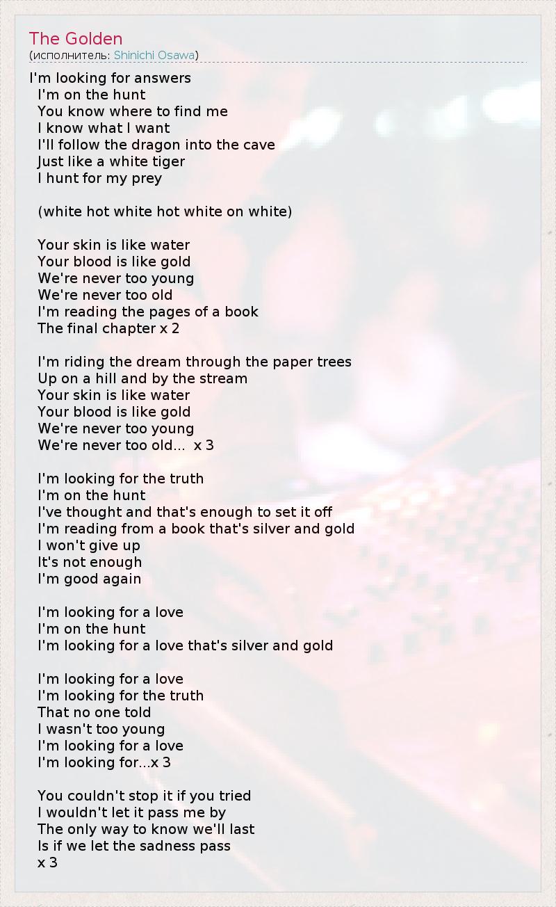 I'm looking for answers I'm on the hunt You know where to find me I know what I want I'll follow the dragon into the cave Just like a white tiger I hunt for my prey (white hot white hot white on white) Your skin is like water Your blood is like gold We're never too young We're never too old I'm reading the pages of a book The final chapter x 2 I'm riding the dream through the paper trees Up on a hill and by the stream Your skin is like water Your blood is like gold We're never too young We're never too old... x 3 I'm looking for the truth I'm on the hunt I've thought and that's enough to set it off I'm reading from a book that's silver and gold I won't give up It's not enough I'm good again I'm looking for a love I'm on the hunt I'm looking for a love that's silver and gold I'm looking for a love I'm looking for the truth That no one told I wasn't too young I'm looking for a love I'm looking for...x 3 You couldn't stop it if you tried I wouldn't let it pass me by The only way to know we'll last Is if we let the sadness pass x 3