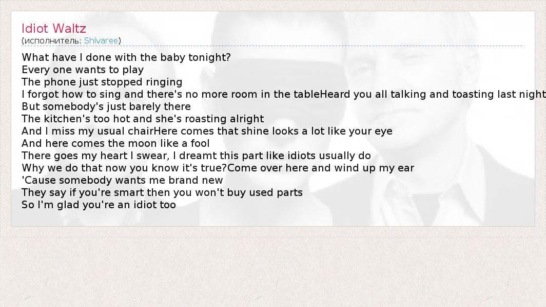 А как ты думаешь, о чем песня "Idiot Waltz" ?