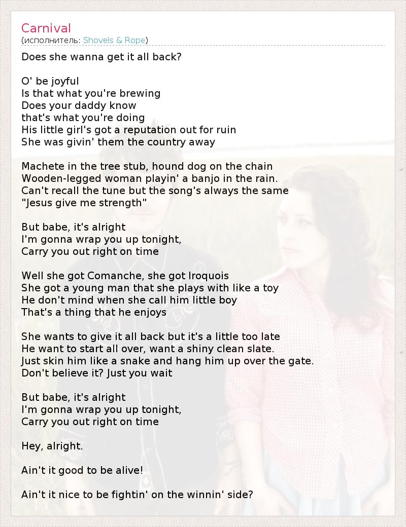 Does she wanna get it all back? O' be joyful Is that what you're brewing Does your daddy know that's what you're doing His little girl's got a reputation out for ruin She was givin' them the country away Machete in the tree stub, hound dog on the chain Wooden-legged woman playin' a banjo in the rain. Can't recall the tune but the song's always the same "Jesus give me strength" But babe, it's alright I'm gonna wrap you up tonight, Carry you out right on time Well she got Comanche, she got Iroquois She got a young man that she plays with like a toy He don't mind when she call him little boy That's a thing that he enjoys She wants to give it all back but it's a little too late He want to start all over, want a shiny clean slate. Just skin him like a snake and hang him up over the gate. Don't believe it? Just you wait But babe, it's alright I'm gonna wrap you up tonight, Carry you out right on time Hey, alright. Ain't it good to be alive! Ain't it nice to be fightin' on the winnin' side?