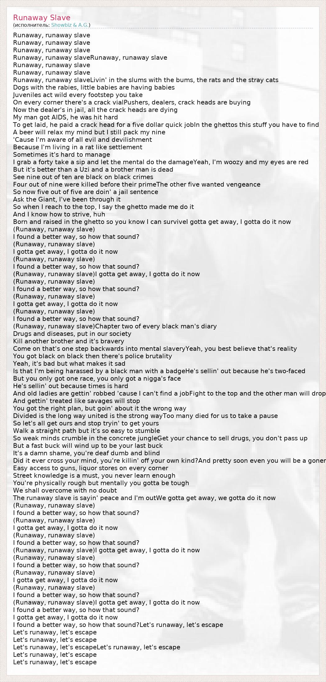 Runaway, runaway slave Runaway, runaway slave Runaway, runaway slave Runaway, runaway slaveRunaway, runaway slave Runaway, runaway slave Runaway, runaway slave Runaway, runaway slaveLivin' in the slums with the bums, the rats and the stray cats Dogs with the rabies, little babies are having babies Juveniles act wild every footstep you take On every corner there's a crack vialPushers, dealers, crack heads are buying Now the dealer's in jail, all the crack heads are dying My man got AIDS, he was hit hard To get laid, he paid a crack head for a five dollar quick jobIn the ghettos this stuff you have to find A beer will relax my mind but I still pack my nine 'Cause I'm aware of all evil and devilishment Because I'm living in a rat like settlement Sometimes it's hard to manage I grab a forty take a sip and let the mental do the damageYeah, I'm woozy and my eyes are red But it's better than a Uzi and a brother man is dead See nine out of ten are black on black crimes Four out of nine were killed before their primeThe other five wanted vengeance So now five out of five are doin' a jail sentence Ask the Giant, I've been through it So when I reach to the top, I say the ghetto made me do it And I know how to strive, huh Born and raised in the ghetto so you know I can surviveI gotta get away, I gotta do it now (Runaway, runaway slave) I found a better way, so how that sound? (Runaway, runaway slave) I gotta get away, I gotta do it now (Runaway, runaway slave) I found a better way, so how that sound? (Runaway, runaway slave)I gotta get away, I gotta do it now (Runaway, runaway slave) I found a better way, so how that sound? (Runaway, runaway slave) I gotta get away, I gotta do it now (Runaway, runaway slave) I found a better way, so how that sound? (Runaway, runaway slave)Chapter two of every black man's diary Drugs and diseases, put in our society Kill another brother and it's bravery Come on that's one step backwards into mental slaveryYeah, you best believe that's reality You got black on black then there's police brutality Yeah, it's bad but what makes it sad Is that I'm being harassed by a black man with a badgeHe's sellin' out because he's two-faced But you only got one race, you only got a nigga's face He's sellin' out because times is hard And old ladies are gettin' robbed 'cause I can't find a jobFight to the top and the other man will drop And gettin' treated like savages will stop You got the right plan, but goin' about it the wrong way Divided is the long way united is the strong wayToo many died for us to take a pause So let's all get ours and stop tryin' to get yours Walk a straight path but it's so easy to stumble So weak minds crumble in the concrete jungleGet your chance to sell drugs, you don't pass up But a fast buck will wind up to be your last buck It's a damn shame, you're deaf dumb and blind Did it ever cross your mind, you're killin' off your own kind?And pretty soon even you will be a goner Easy access to guns, liquor stores on every corner Street knowledge is a must, you never learn enough You're physically rough but mentally you gotta be tough We shall overcome with no doubt The runaway slave is sayin' peace and I'm outWe gotta get away, we gotta do it now (Runaway, runaway slave) I found a better way, so how that sound? (Runaway, runaway slave) I gotta get away, I gotta do it now (Runaway, runaway slave) I found a better way, so how that sound? (Runaway, runaway slave)I gotta get away, I gotta do it now (Runaway, runaway slave) I found a better way, so how that sound? (Runaway, runaway slave) I gotta get away, I gotta do it now (Runaway, runaway slave) I found a better way, so how that sound? (Runaway, runaway slave)I gotta get away, I gotta do it now I found a better way, so how that sound? I gotta get away, I gotta do it now I found a better way, so how that sound?Let's runaway, let's escape Let's runaway, let's escape Let's runaway, let's escape Let's runaway, let's escapeLet's runaway, let's escape Let's runaway, let's escape Let's runaway, let's escape