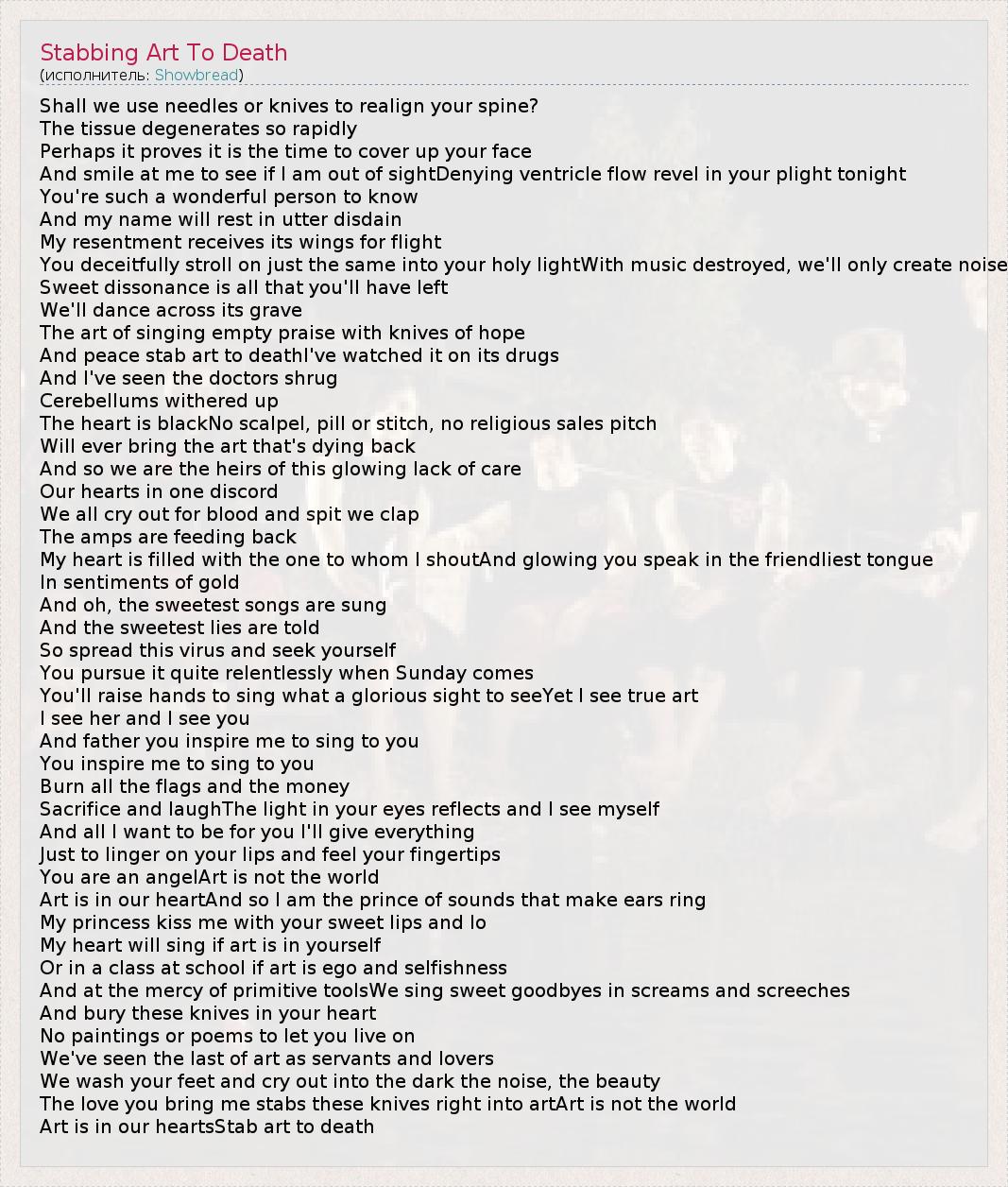 А как ты думаешь, о чем песня "Stabbing Art To Death" ?