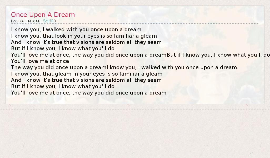You'll love me at once, the way you did once upon a dreamBut if I know you, I know what you'll do