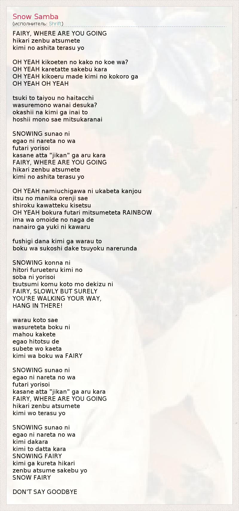 FAIRY, WHERE ARE YOU GOING hikari zenbu atsumete kimi no ashita terasu yo OH YEAH kikoeten no kako no koe wa? OH YEAH karetatte sakebu kara OH YEAH kikoeru made kimi no kokoro ga OH YEAH OH YEAH tsuki to taiyou no haitacchi wasuremono wanai desuka? okashii na kimi ga inai to hoshii mono sae mitsukaranai SNOWING sunao ni egao ni nareta no wa futari yorisoi kasane atta "jikan" ga aru kara FAIRY, WHERE ARE YOU GOING hikari zenbu atsumete kimi no ashita terasu yo OH YEAH namiuchigawa ni ukabeta kanjou itsu no manika orenji sae shiroku kawatteku kisetsu OH YEAH bokura futari mitsumeteta RAINBOW ima wa omoide no naga de nanairo ga yuki ni kawaru fushigi dana kimi ga warau to boku wa sukoshi dake tsuyoku narerunda SNOWING konna ni hitori furueteru kimi no soba ni yorisoi tsutsumi komu koto mo dekizu ni FAIRY, SLOWLY BUT SURELY YOU'RE WALKING YOUR WAY, HANG IN THERE! warau koto sae wasureteta boku ni mahou kakete egao hitotsu de subete wo kaeta kimi wa boku wa FAIRY SNOWING sunao ni egao ni nareta no wa futari yorisoi kasane atta "jikan" ga aru kara FAIRY, WHERE ARE YOU GOING hikari zenbu atsumete kimi wo terasu yo SNOWING sunao ni egao ni nareta no wa kimi dakara kimi to datta kara SNOWING FAIRY kimi ga kureta hikari zenbu atsume sakebu yo SNOW FAIRY DON'T SAY GOODBYE