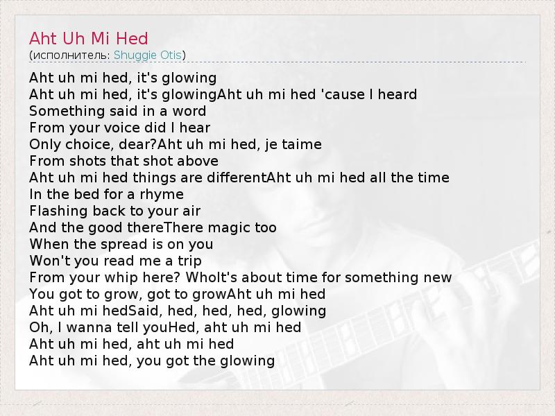 Aht uh mi hed, it's glowing Aht uh mi hed, it's glowingAht uh mi hed 'cause I heard Something said in a word From your voice did I hear Only choice, dear?Aht uh mi hed, je taime From shots that shot above Aht uh mi hed things are differentAht uh mi hed all the time In the bed for a rhyme Flashing back to your air And the good thereThere magic too When the spread is on you Won't you read me a trip From your whip here? WhoIt's about time for something new You got to grow, got to growAht uh mi hed Aht uh mi hedSaid, hed, hed, hed, glowing Oh, I wanna tell youHed, aht uh mi hed Aht uh mi hed, aht uh mi hed Aht uh mi hed, you got the glowing