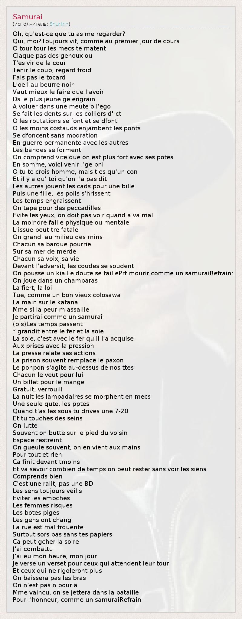 On pousse un kiaiLe doute se taillePrt mourir comme un samuraiRefrain: