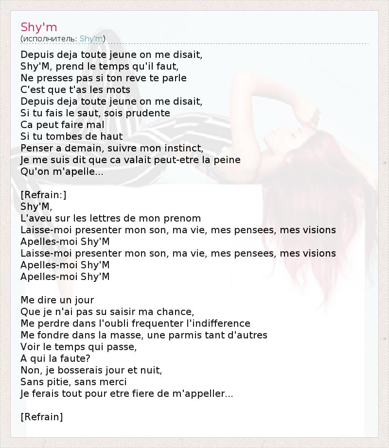 Depuis deja toute jeune on me disait, Shy'M, prend le temps qu'il faut, Ne presses pas si ton reve te parle C'est que t'as les mots Depuis deja toute jeune on me disait, Si tu fais le saut, sois prudente Ca peut faire mal Si tu tombes de haut Penser a demain, suivre mon instinct, Je me suis dit que ca valait peut-etre la peine Qu'on m'apelle... [Refrain:] Shy'M, L'aveu sur les lettres de mon prenom Laisse-moi presenter mon son, ma vie, mes pensees, mes visions Apelles-moi Shy'M Laisse-moi presenter mon son, ma vie, mes pensees, mes visions Apelles-moi Shy'M Apelles-moi Shy'M Me dire un jour Que je n'ai pas su saisir ma chance, Me perdre dans l'oubli frequenter l'indifference Me fondre dans la masse, une parmis tant d'autres Voir le temps qui passe, A qui la faute? Non, je bosserais jour et nuit, Sans pitie, sans merci Je ferais tout pour etre fiere de m'appeller... [Refrain]