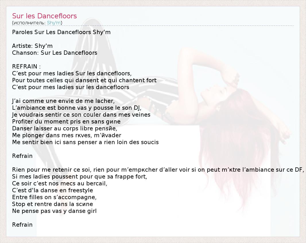 Paroles Sur Les Dancefloors Shy'm Artiste: Shy'm Chanson: Sur Les Dancefloors REFRAIN : C’est pour mes ladies Sur les dancefloors, Pour toutes celles qui dansent et qui chantent fort C’est pour mes ladies sur les dancefloors J’ai comme une envie de me lвcher, L’ambiance est bonne vas y pousse le son DJ, Je voudrais sentir ce son couler dans mes veines Profiter du moment pris en sans gиne Danser laisser au corps libre pensйe, Me plonger dans mes rкves, m’йvader Me sentir bien ici sans penser а rien loin des soucis Refrain Rien pour me retenir ce soi, rien pour m’empкcher d’aller voir si on peut m’кtre l’ambiance sur ce DF, Si mes ladies poussent pour que зa frappe fort, Ce soir c’est nos mecs au bercail, C’est d'la danse en freestyle Entre filles on s’accompagne, Stop et rentre dans la scиne Ne pense pas vas y danse girl Refrain