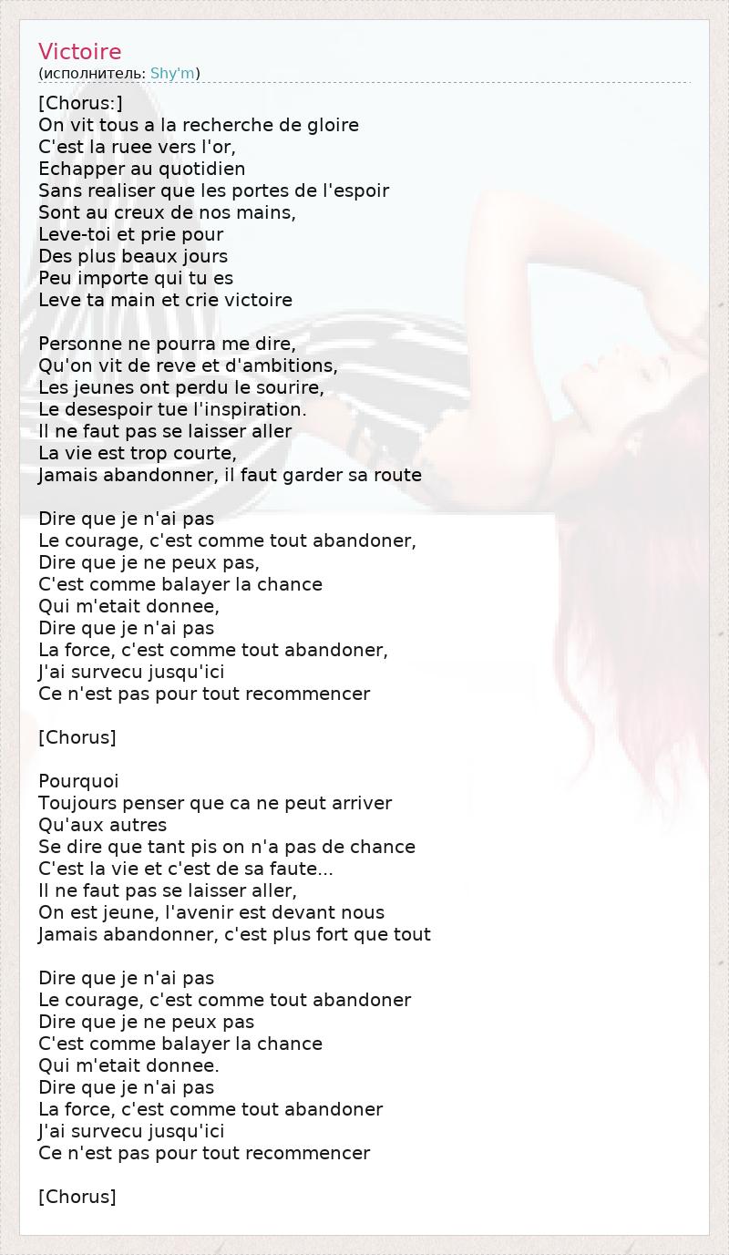 [Chorus:] On vit tous a la recherche de gloire C'est la ruee vers l'or, Echapper au quotidien Sans realiser que les portes de l'espoir Sont au creux de nos mains, Leve-toi et prie pour Des plus beaux jours Peu importe qui tu es Leve ta main et crie victoire Personne ne pourra me dire, Qu'on vit de reve et d'ambitions, Les jeunes ont perdu le sourire, Le desespoir tue l'inspiration. Il ne faut pas se laisser aller La vie est trop courte, Jamais abandonner, il faut garder sa route Dire que je n'ai pas Le courage, c'est comme tout abandoner, Dire que je ne peux pas, C'est comme balayer la chance Qui m'etait donnee, Dire que je n'ai pas La force, c'est comme tout abandoner, J'ai survecu jusqu'ici Ce n'est pas pour tout recommencer [Chorus] Pourquoi Toujours penser que ca ne peut arriver Qu'aux autres Se dire que tant pis on n'a pas de chance C'est la vie et c'est de sa faute... Il ne faut pas se laisser aller, On est jeune, l'avenir est devant nous Jamais abandonner, c'est plus fort que tout Dire que je n'ai pas Le courage, c'est comme tout abandoner Dire que je ne peux pas C'est comme balayer la chance Qui m'etait donnee. Dire que je n'ai pas La force, c'est comme tout abandoner J'ai survecu jusqu'ici Ce n'est pas pour tout recommencer [Chorus]