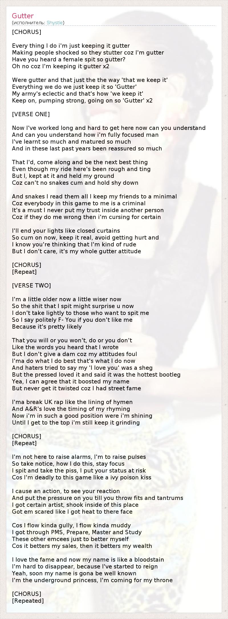 [CHORUS] Every thing I do i'm just keeping it gutter Making people shocked so they stutter coz I'm gutter Have you heard a female spit so gutter? Oh no coz I'm keeping it gutter x2 Were gutter and that just the the way 'that we keep it' Everything we do we just keep it so 'Gutter' My army's eclectic and that's how 'we keep it' Keep on, pumping strong, going on so 'Gutter' x2 [VERSE ONE] Now I've worked long and hard to get here now can you understand And can you understand how i'm fully focused man I've learnt so much and matured so much And in these last past years been reassured so much That I'd, come along and be the next best thing Even though my ride here's been rough and ting But I, kept at it and held my ground Coz can't no snakes cum and hold shy down And snakes I read them all I keep my friends to a minimal Coz everybody in this game to me is a criminal It's a must I never put my trust inside another person Coz if they do me wrong then i'm cursing for certain I'll end your lights like closed curtains So cum on now, keep it real, avoid getting hurt and I know you're thinking that I'm kind of rude But I don't care, it's my whole gutter attitude [CHORUS] [Repeat] [VERSE TWO] I'm a little older now a little wiser now So the shit that I spit might surprise u now I don't take lightly to those who want to spit me So I say politely F- You if you don't like me Because it's pretty likely That you will or you won't, do or you don't Like the words you heard that I wrote But I don't give a dam coz my attitudes foul I'ma do what I do best that's what I do now And haters tried to say my 'I love you' was a sheg But the pressed loved it and said it was the hottest bootleg Yea, I can agree that it boosted my name But never get it twisted coz I had street fame I'ma break UK rap like the lining of hymen And A&R's love the timing of my rhyming Now i'm in such a good position were i'm shining Until I get to the top i'm still keep it grinding [CHORUS] [Repeat] I'm not here to raise alarms, I'm to raise pulses So take notice, how I do this, stay focus I spit and take the piss, I put your status at risk Cos I'm deadly to this game like a ivy poison kiss I cause an action, to see your reaction And put the pressure on you till you throw fits and tantrums I got certain artist, shook inside of this place Got em scared like I got heat to there face Cos I flow kinda gully, I flow kinda muddy I got through PMS, Prepare, Master and Study These other emcees just to better myself Cos it betters my sales, then it betters my wealth I love the fame and now my name is like a bloodstain I'm hard to disappear, because I've started to reign Yeah, soon my name is gona be well known I'm the underground princess, I'm coming for my throne [CHORUS] [Repeated]