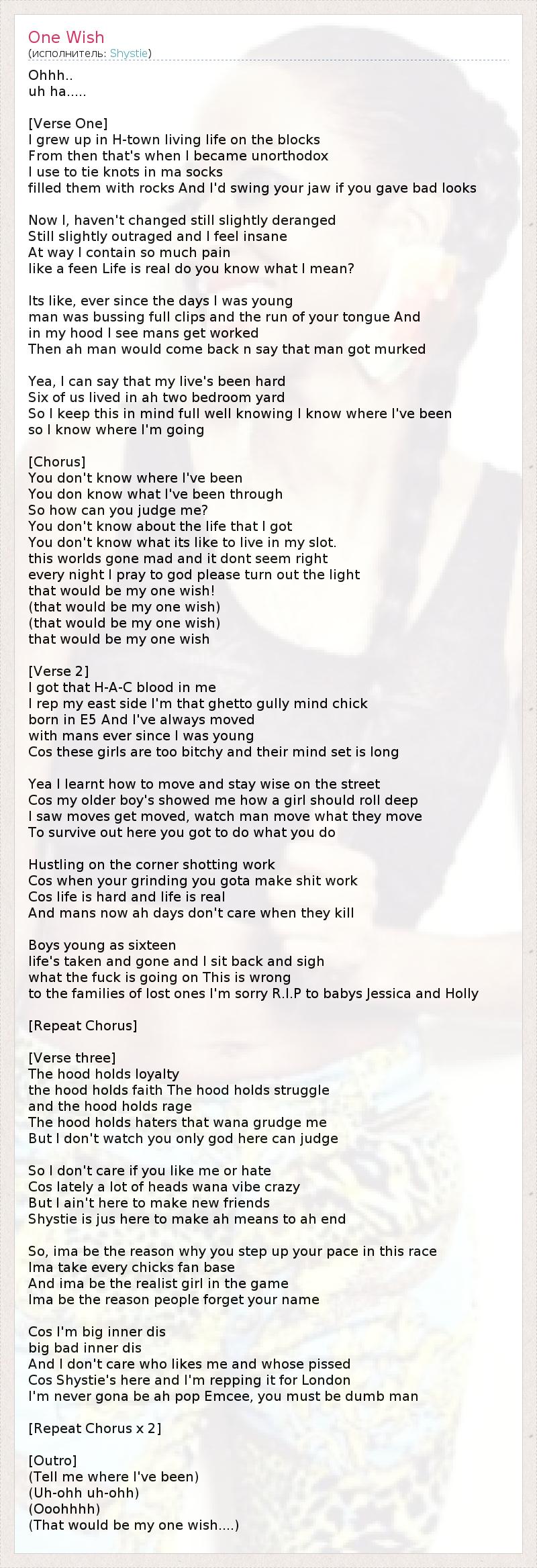 Ohhh.. uh ha..... [Verse One] I grew up in H-town living life on the blocks From then that's when I became unorthodox I use to tie knots in ma socks filled them with rocks And I'd swing your jaw if you gave bad looks Now I, haven't changed still slightly deranged Still slightly outraged and I feel insane At way I contain so much pain like a feen Life is real do you know what I mean? Its like, ever since the days I was young man was bussing full clips and the run of your tongue And in my hood I see mans get worked Then ah man would come back n say that man got murked Yea, I can say that my live's been hard Six of us lived in ah two bedroom yard So I keep this in mind full well knowing I know where I've been so I know where I'm going [Chorus] You don't know where I've been You don know what I've been through So how can you judge me? You don't know about the life that I got You don't know what its like to live in my slot. this worlds gone mad and it dont seem right every night I pray to god please turn out the light that would be my one wish! (that would be my one wish) (that would be my one wish) that would be my one wish [Verse 2] I got that H-A-C blood in me I rep my east side I'm that ghetto gully mind chick born in E5 And I've always moved with mans ever since I was young Cos these girls are too bitchy and their mind set is long Yea I learnt how to move and stay wise on the street Cos my older boy's showed me how a girl should roll deep I saw moves get moved, watch man move what they move To survive out here you got to do what you do Hustling on the corner shotting work Cos when your grinding you gota make shit work Cos life is hard and life is real And mans now ah days don't care when they kill Boys young as sixteen life's taken and gone and I sit back and sigh what the fuck is going on This is wrong to the families of lost ones I'm sorry R.I.P to babys Jessica and Holly [Repeat Chorus] [Verse three] The hood holds loyalty the hood holds faith The hood holds struggle and the hood holds rage The hood holds haters that wana grudge me But I don't watch you only god here can judge So I don't care if you like me or hate Cos lately a lot of heads wana vibe crazy But I ain't here to make new friends Shystie is jus here to make ah means to ah end So, ima be the reason why you step up your pace in this race Ima take every chicks fan base And ima be the realist girl in the game Ima be the reason people forget your name Cos I'm big inner dis big bad inner dis And I don't care who likes me and whose pissed Cos Shystie's here and I'm repping it for London I'm never gona be ah pop Emcee, you must be dumb man [Repeat Chorus x 2] [Outro] (Tell me where I've been) (Uh-ohh uh-ohh) (Ooohhhh) (That would be my one wish....)