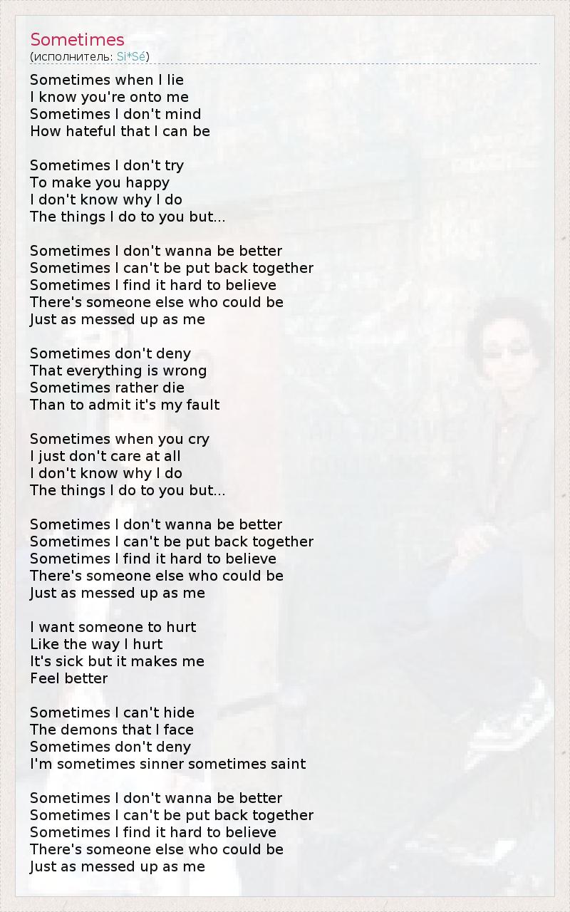 Sometimes when I lie I know you're onto me Sometimes I don't mind How hateful that I can be Sometimes I don't try To make you happy I don't know why I do The things I do to you but... Sometimes I don't wanna be better Sometimes I can't be put back together Sometimes I find it hard to believe There's someone else who could be Just as messed up as me Sometimes don't deny That everything is wrong Sometimes rather die Than to admit it's my fault Sometimes when you cry I just don't care at all I don't know why I do The things I do to you but... Sometimes I don't wanna be better Sometimes I can't be put back together Sometimes I find it hard to believe There's someone else who could be Just as messed up as me I want someone to hurt Like the way I hurt It's sick but it makes me Feel better Sometimes I can't hide The demons that I face Sometimes don't deny I'm sometimes sinner sometimes saint Sometimes I don't wanna be better Sometimes I can't be put back together Sometimes I find it hard to believe There's someone else who could be Just as messed up as me