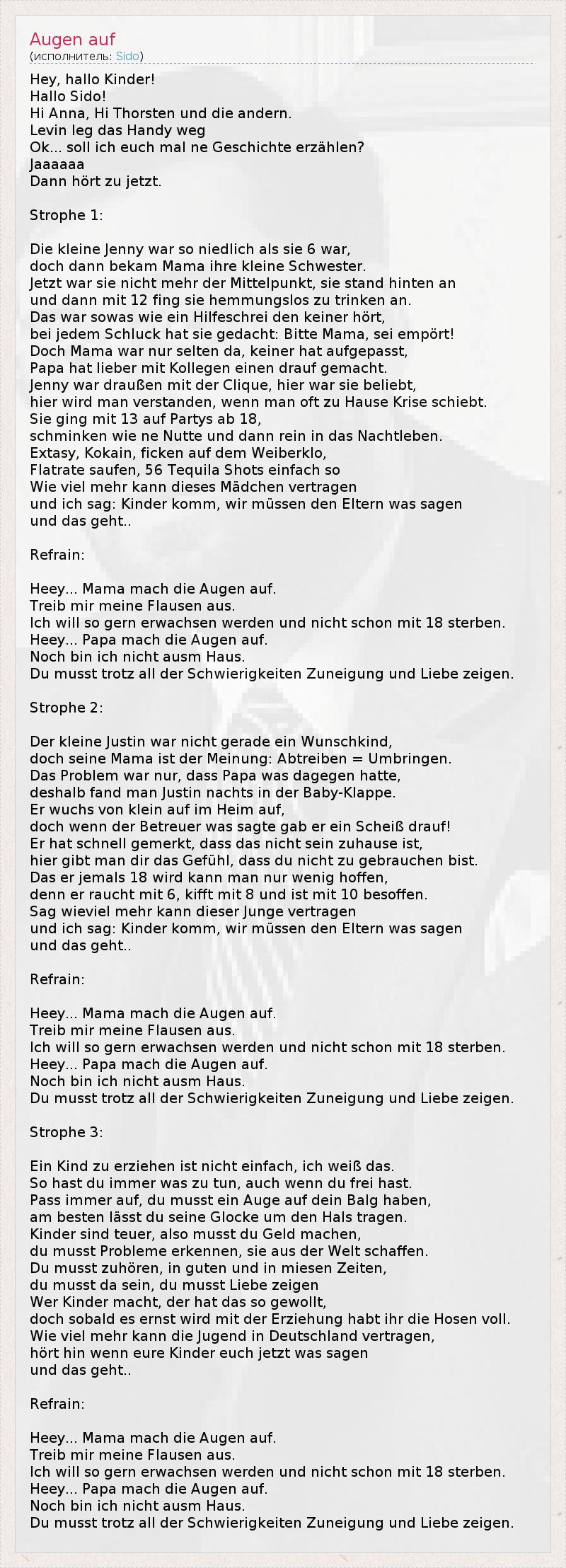 Это интересно:Sido родился 30 Ноября 1980 года в Берлине, настоящее имя Paul Wurdig. В 2001-2009 входил в немецкий лейбл Aggro Berlin.Sido отличается необычными агрессивными и провокационными текстами, но несмотря на это имеет лаконичный оттенок в голосе.Долгое время Sido вообще не снимал маску чтобы скрыть своё истинное лицо. Теперь он носит ее только как собственную визитную карточку.Sido рос с матерью и младшей... продолжение