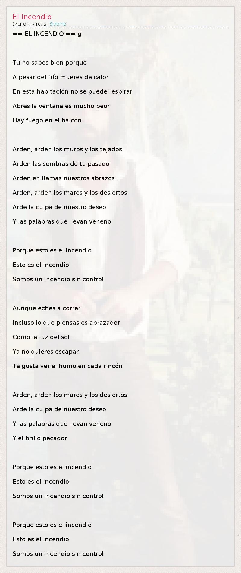 == EL INCENDIO == g Tú no sabes bien porqué A pesar del frío mueres de calor En esta habitación no se puede respirar Abres la ventana es mucho peor Hay fuego en el balcón. Arden, arden los muros y los tejados Arden las sombras de tu pasado Arden en llamas nuestros abrazos. Arden, arden los mares y los desiertos Arde la culpa de nuestro deseo Y las palabras que llevan veneno Porque esto es el incendio Esto es el incendio Somos un incendio sin control Aunque eches a correr Incluso lo que piensas es abrazador Como la luz del sol Ya no quieres escapar Te gusta ver el humo en cada rincón Arden, arden los mares y los desiertos Arde la culpa de nuestro deseo Y las palabras que llevan veneno Y el brillo pecador Porque esto es el incendio Esto es el incendio Somos un incendio sin control Porque esto es el incendio Esto es el incendio Somos un incendio sin control