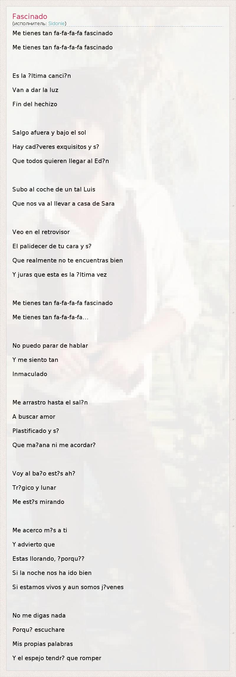 Me tienes tan fa-fa-fa-fa fascinado Me tienes tan fa-fa-fa-fa fascinado Es la ?ltima canci?n Van a dar la luz Fin del hechizo Salgo afuera y bajo el sol Hay cad?veres exquisitos y s? Que todos quieren llegar al Ed?n Subo al coche de un tal Luis Que nos va al llevar a casa de Sara Veo en el retrovisor El palidecer de tu cara y s? Que realmente no te encuentras bien Y juras que esta es la ?ltima vez Me tienes tan fa-fa-fa-fa fascinado Me tienes tan fa-fa-fa-fa… No puedo parar de hablar Y me siento tan Inmaculado Me arrastro hasta el sal?n A buscar amor Plastificado y s? Que ma?ana ni me acordar? Voy al ba?o est?s ah? Tr?gico y lunar Me est?s mirando Me acerco m?s a ti Y advierto que Estas llorando, ?porqu?? Si la noche nos ha ido bien Si estamos vivos y aun somos j?venes No me digas nada Porqu? escuchare Mis propias palabras Y el espejo tendr? que romper