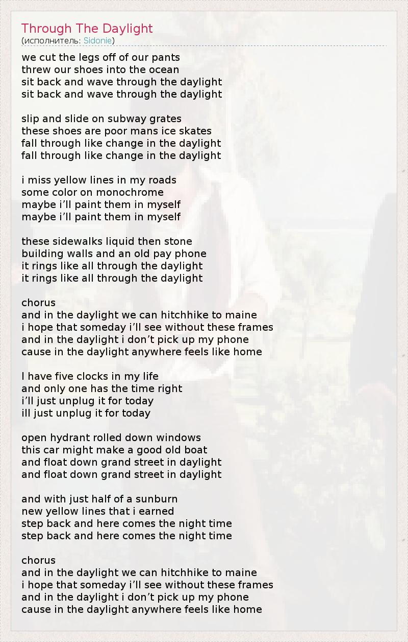 Мы выпрыгнули из наших штанов, Выбросили наши ботинки в океан, Рассслабились и просякли дневным светом Рассслабились и просякли дневным светом Проскальзываем через ворота метро Эти ботинки как коньки бедняка Терпим неудачу как перемены в дневном свете Терпим неудачу как перемены в дневном свете Я пропускаю желтые лучи на своем пути Некий монохромный цвет Возможно, я нарисую их в себе Возможно, я нарисую их в себе Эти плавные тротуары, дальше каменных домов стены и старый телефон-автомат, Это все охватывает дневной свет Это все охватывает дневной свет И в дневном свете мы можем путешествовать автостопом в Штат Мэн Я надеюсь, что когда-нибудь я увижу тебя без этих Рамок И в дневном свете я не беру свой Телефон Ведь в дневном свете везде чувствуешь себя как Дома У меня есть пять часов в моей жизни И только одни показывают правельное время Я просто отключу это сегодня Я просто отключу это сегодня Открытый гидрант пробежался по окнам Из этого автомобиля можно бы сделать хорошую старую лодку И пустить в ход вниз по великой улице в дневном свете И пустить в ход вниз по великой улице в дневном свете И с только половиной загара Новые желтые лучи, которые я получил Отступают назад и приходит вечернее время Отступают назад и приходит вечернее время И в дневном свете мы можем путешествовать автостопом в Штат Мэн Я надеюсь, что когда-нибудь я увижу тебя без этих Рамок И в дневном свете я не беру свой Телефон Ведь в дневном свете везде чувствуешь себя как Дома