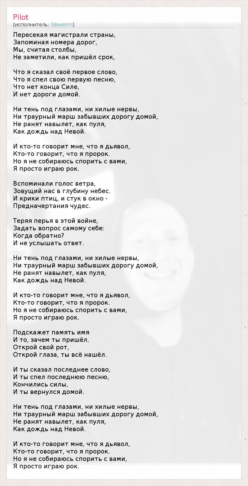 Пересекая магистрали страны, Запоминая номера дорог, Мы, считая столбы, Не заметили, как пришёл срок, Что я сказал своё первое слово, Что я спел свою первую песню, Что нет конца Силе, И нет дороги домой. Ни тень под глазами, ни хилые нервы, Ни траурный марш забывших дорогу домой, Не ранят навылет, как пуля, Как дождь над Невой. И кто-то говорит мне, что я дьявол, Кто-то говорит, что я пророк. Но я не собираюсь спорить с вами, Я просто играю рок. Вспоминали голос ветра, Зовущий нас в глубину небес. И крики птиц, и стук в окно - Предначертания чудес. Теряя перья в этой войне, Задать вопрос самому себе: Когда обратно? И не услышать ответ. Ни тень под глазами, ни хилые нервы, Ни траурный марш забывших дорогу домой, Не ранят навылет, как пуля, Как дождь над Невой. И кто-то говорит мне, что я дьявол, Кто-то говорит, что я пророк. Но я не собираюсь спорить с вами, Я просто играю рок. Подскажет память имя И то, зачем ты пришёл. Открой свой рот, Открой глаза, ты всё нашёл. И ты сказал последнее слово, И ты спел последнюю песню, Кончились силы, И ты вернулся домой. Ни тень под глазами, ни хилые нервы, Ни траурный марш забывших дорогу домой, Не ранят навылет, как пуля, Как дождь над Невой. И кто-то говорит мне, что я дьявол, Кто-то говорит, что я пророк. Но я не собираюсь спорить с вами, Я просто играю рок.