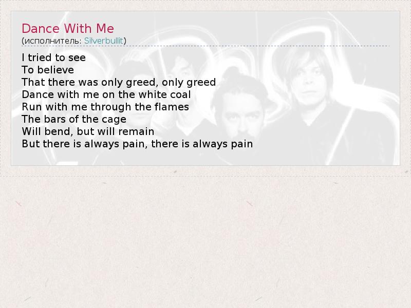 Я пытался понять, Поверить, Что это была лишь жадность, только жадность. Танцуй со мной на белом пепле, Беги со мной через пламя. Прутья клетки Согнутся, но останутся на своём месте. Но всегда есть боль, всегда есть боль....
