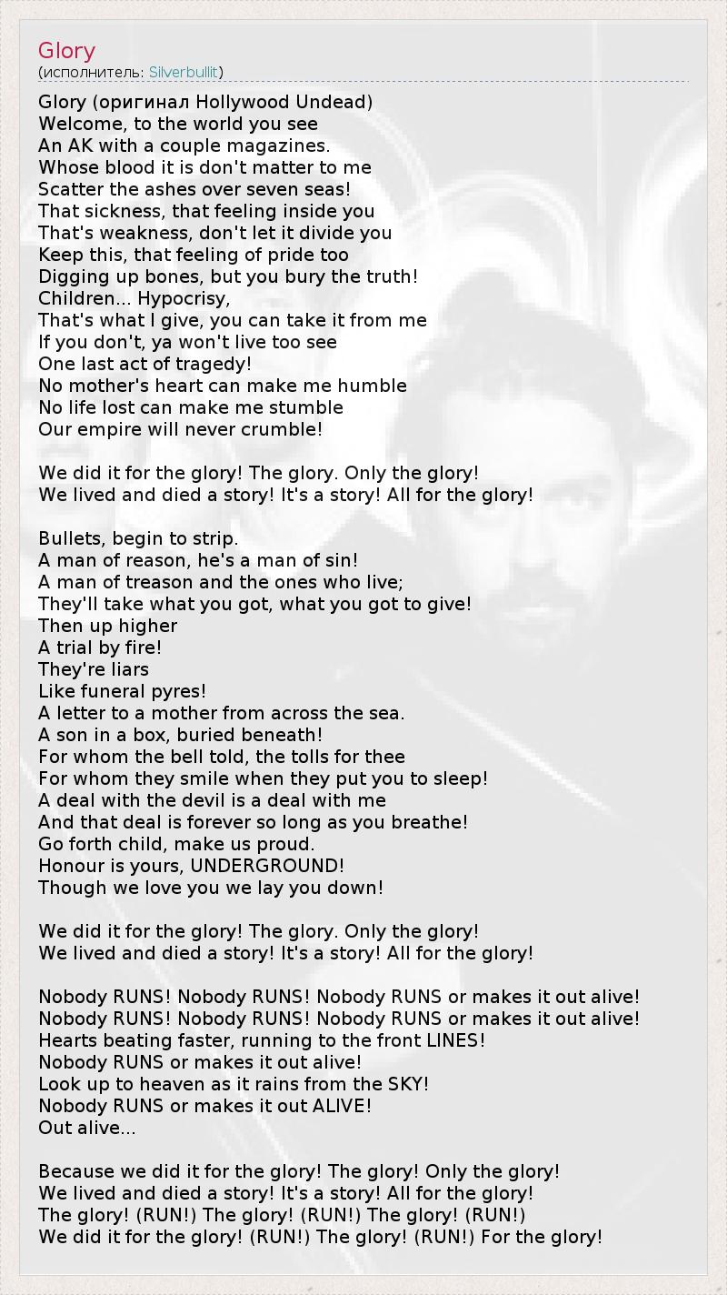 We did it for the glory! (RUN!) The glory! (RUN!) For the glory!