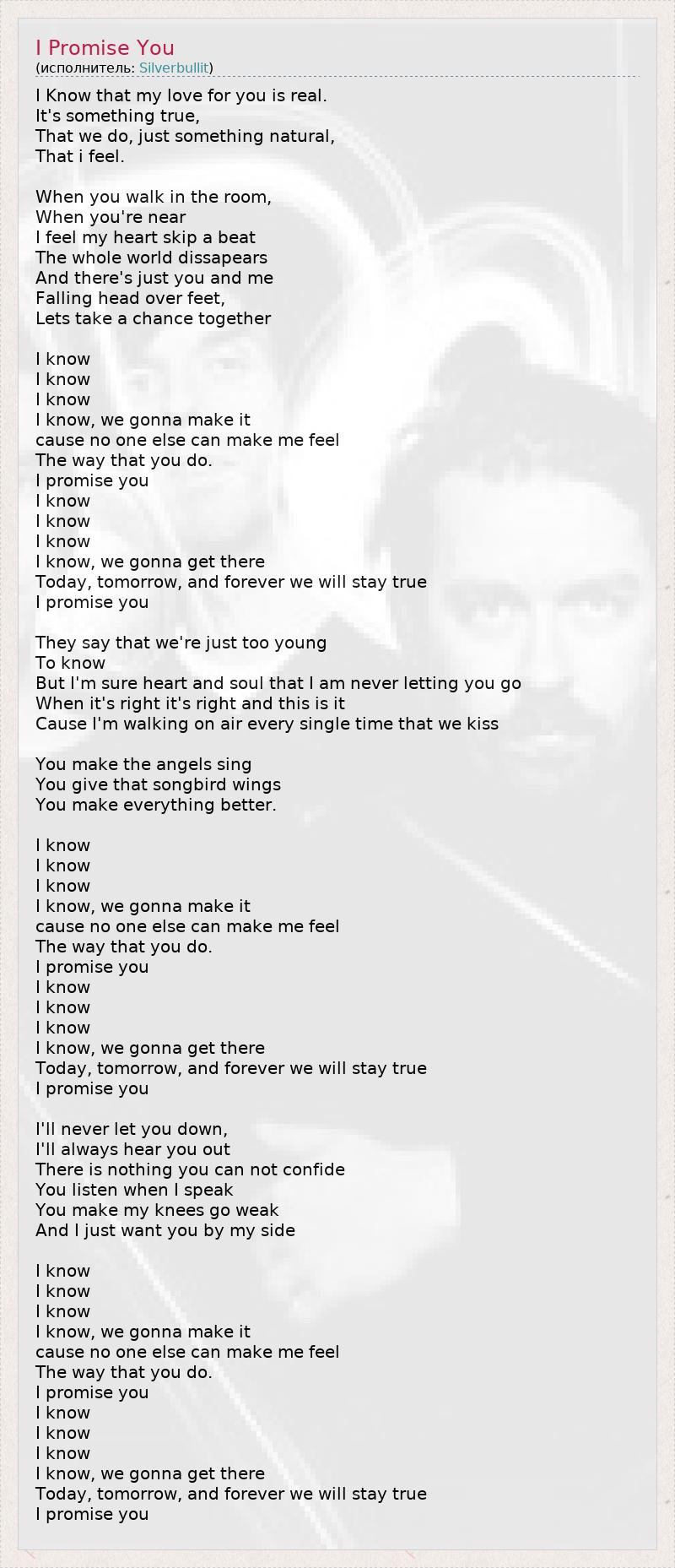 I Know that my love for you is real. It's something true, That we do, just something natural, That i feel. When you walk in the room, When you're near I feel my heart skip a beat The whole world dissapears And there's just you and me Falling head over feet, Lets take a chance together I know I know I know I know, we gonna make it cause no one else can make me feel The way that you do. I promise you I know I know I know I know, we gonna get there Today, tomorrow, and forever we will stay true I promise you They say that we're just too young To know But I'm sure heart and soul that I am never letting you go When it's right it's right and this is it Cause I'm walking on air every single time that we kiss You make the angels sing You give that songbird wings You make everything better. I know I know I know I know, we gonna make it cause no one else can make me feel The way that you do. I promise you I know I know I know I know, we gonna get there Today, tomorrow, and forever we will stay true I promise you I'll never let you down, I'll always hear you out There is nothing you can not confide You listen when I speak You make my knees go weak And I just want you by my side I know I know I know I know, we gonna make it cause no one else can make me feel The way that you do. I promise you I know I know I know I know, we gonna get there Today, tomorrow, and forever we will stay true I promise you