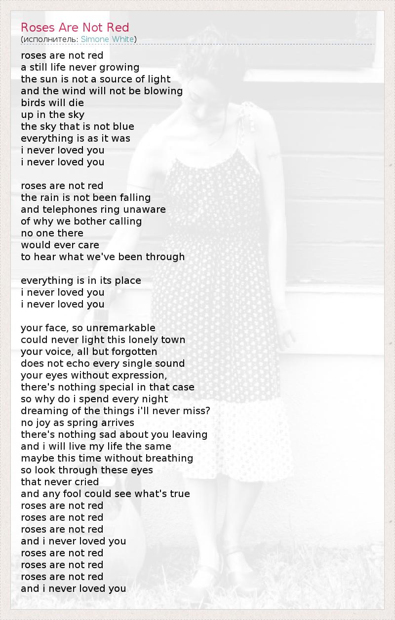 roses are not red a still life never growing the sun is not a source of light and the wind will not be blowing birds will die up in the sky the sky that is not blue everything is as it was i never loved you i never loved you roses are not red the rain is not been falling and telephones ring unaware of why we bother calling no one there would ever care to hear what we've been through everything is in its place i never loved you i never loved you your face, so unremarkable could never light this lonely town your voice, all but forgotten does not echo every single sound your eyes without expression, there's nothing special in that case so why do i spend every night dreaming of the things i'll never miss? no joy as spring arrives there's nothing sad about you leaving and i will live my life the same maybe this time without breathing so look through these eyes that never cried and any fool could see what's true roses are not red roses are not red roses are not red and i never loved you roses are not red roses are not red roses are not red and i never loved you