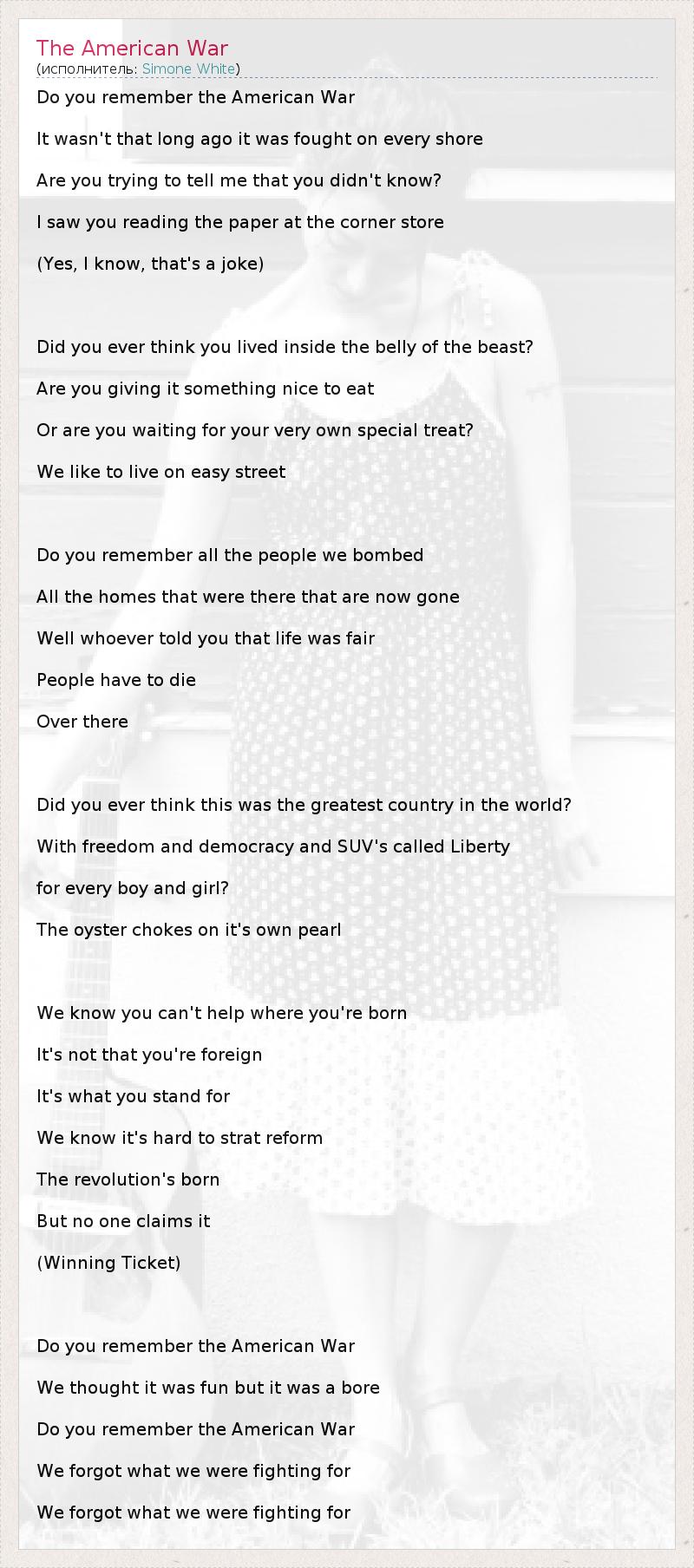 Do you remember the American War It wasn't that long ago it was fought on every shore Are you trying to tell me that you didn't know? I saw you reading the paper at the corner store (Yes, I know, that's a joke) Did you ever think you lived inside the belly of the beast? Are you giving it something nice to eat Or are you waiting for your very own special treat? We like to live on easy street Do you remember all the people we bombed All the homes that were there that are now gone Well whoever told you that life was fair People have to die Over there Did you ever think this was the greatest country in the world? With freedom and democracy and SUV's called Liberty for every boy and girl? The oyster chokes on it's own pearl We know you can't help where you're born It's not that you're foreign It's what you stand for We know it's hard to strat reform The revolution's born But no one claims it (Winning Ticket) Do you remember the American War We thought it was fun but it was a bore Do you remember the American War We forgot what we were fighting for We forgot what we were fighting for