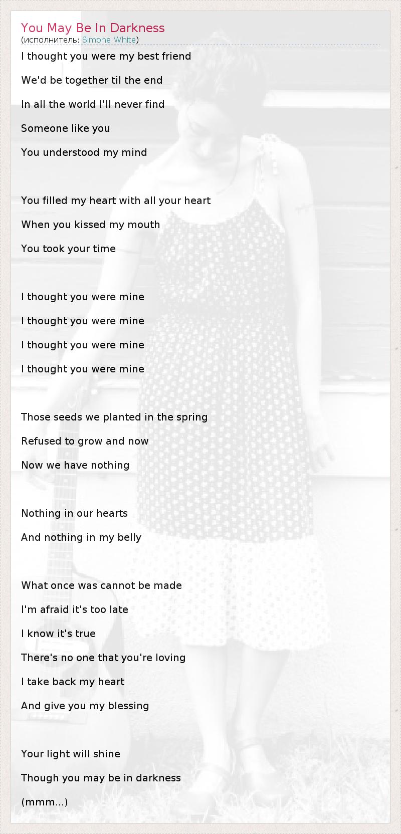 I thought you were my best friend We'd be together til the end In all the world I'll never find Someone like you You understood my mind You filled my heart with all your heart When you kissed my mouth You took your time I thought you were mine I thought you were mine I thought you were mine I thought you were mine Those seeds we planted in the spring Refused to grow and now Now we have nothing Nothing in our hearts And nothing in my belly What once was cannot be made I'm afraid it's too late I know it's true There's no one that you're loving I take back my heart And give you my blessing Your light will shine Though you may be in darkness (mmm...)