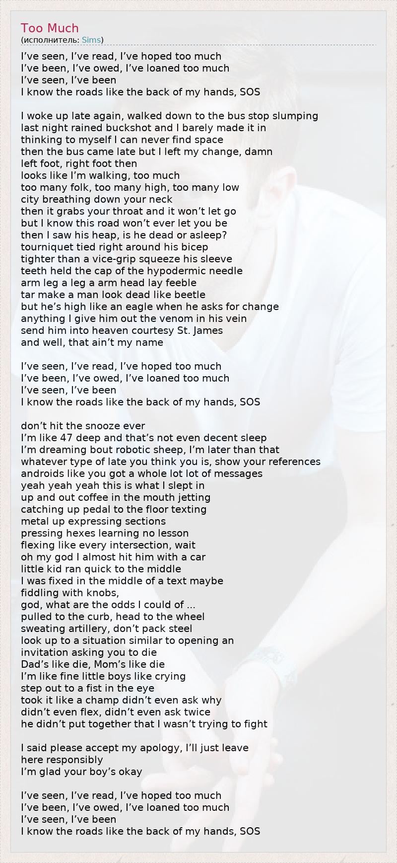 I’ve seen, I’ve read, I’ve hoped too much I’ve been, I’ve owed, I’ve loaned too much I’ve seen, I’ve been I know the roads like the back of my hands, SOS I woke up late again, walked down to the bus stop slumping last night rained buckshot and I barely made it in thinking to myself I can never find space then the bus came late but I left my change, damn left foot, right foot then looks like I’m walking, too much too many folk, too many high, too many low city breathing down your neck then it grabs your throat and it won’t let go but I know this road won’t ever let you be then I saw his heap, is he dead or asleep? tourniquet tied right around his bicep tighter than a vice-grip squeeze his sleeve teeth held the cap of the hypodermic needle arm leg a leg a arm head lay feeble tar make a man look dead like beetle but he’s high like an eagle when he asks for change anything I give him out the venom in his vein send him into heaven courtesy St. James and well, that ain’t my name I’ve seen, I’ve read, I’ve hoped too much I’ve been, I’ve owed, I’ve loaned too much I’ve seen, I’ve been I know the roads like the back of my hands, SOS don’t hit the snooze ever I’m like 47 deep and that’s not even decent sleep I’m dreaming bout robotic sheep, I’m later than that whatever type of late you think you is, show your references androids like you got a whole lot lot of messages yeah yeah yeah this is what I slept in up and out coffee in the mouth jetting catching up pedal to the floor texting metal up expressing sections pressing hexes learning no lesson flexing like every intersection, wait oh my god I almost hit him with a car little kid ran quick to the middle I was fixed in the middle of a text maybe fiddling with knobs, god, what are the odds I could of ... pulled to the curb, head to the wheel sweating artillery, don’t pack steel look up to a situation similar to opening an invitation asking you to die Dad’s like die, Mom’s like die I’m like fine little boys like crying step out to a fist in the eye took it like a champ didn’t even ask why didn’t even flex, didn’t even ask twice he didn’t put together that I wasn’t trying to fight I said please accept my apology, I’ll just leave here responsibly I’m glad your boy’s okay I’ve seen, I’ve read, I’ve hoped too much I’ve been, I’ve owed, I’ve loaned too much I’ve seen, I’ve been I know the roads like the back of my hands, SOS