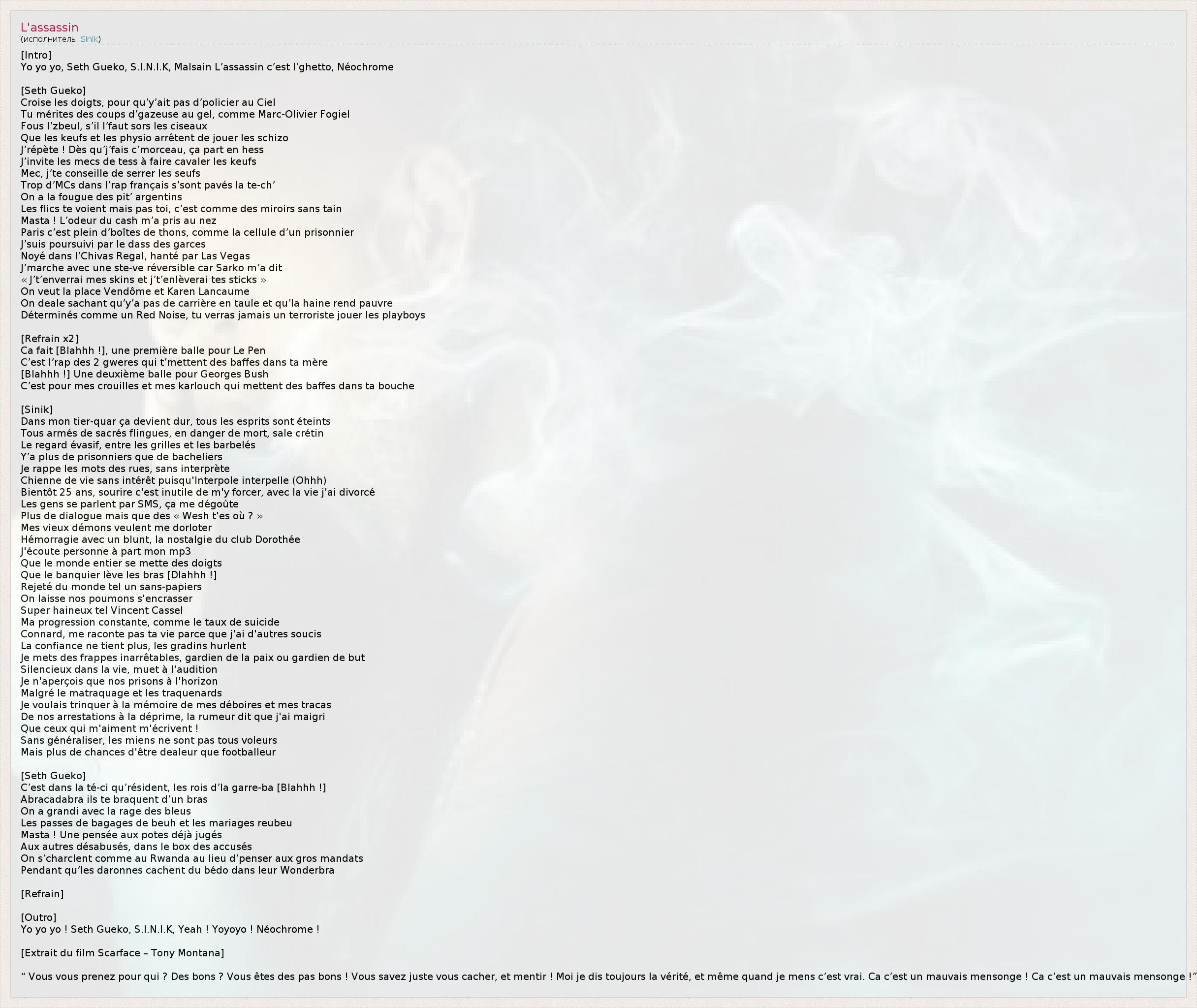 Yo yo yo ! Seth Gueko, S.I.N.I.K, Yeah ! Yoyoyo ! Néochrome !