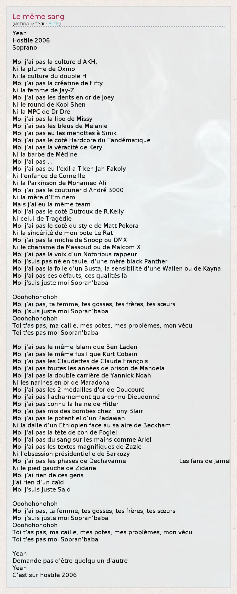 Yeah Hostile 2006 Soprano Moi j'ai pas la culture d'AKH, Ni la plume de Oxmo Ni la culture du double H Moi j'ai pas la créatine de Fifty Ni la femme de Jay-Z Moi j'ai pas les dents en or de Joey Ni le round de Kool Shen Ni la MPC de Dr.Dre Moi j'ai pas la lipo de Missy Moi j'ai pas les bleus de Melanie Moi j'ai pas eu les menottes à Sinik Moi j'ai pas le coté Hardcore du Tandématique Moi j'ai pas la véracité de Kery Ni la barbe de Médine Moi j'ai pas ... Moi j'ai pas eu l'exil a Tiken Jah Fakoly Ni l'enfance de Corneille Ni la Parkinson de Mohamed Ali Moi j'ai pas le couturier d'André 3000 Ni la mère d'Eminem Mais j'ai eu la même team Moi j'ai pas le coté Dutroux de R.Kelly Ni celui de Tragédie Moi j'ai pas le coté du style de Matt Pokora Ni la sincérité de mon pote Le Rat Moi j'ai pas la miche de Snoop ou DMX Ni le charisme de Massoud ou de Malcom X Moi j'ai pas la voix d'un Notorious rappeur Moi j'suis pas né en taule, d'une mère black Panther Moi j'ai pas la folie d'un Busta, la sensibilité d'une Wallen ou de Kayna Moi j'ai pas ces défauts, ces qualités là Moi j'suis juste moi Sopran'baba Ooohohohohoh Moi j'ai pas, ta femme, tes gosses, tes frères, tes sœurs Moi j'suis juste moi Sopran'baba Ooohohohohoh Toi t'as pas, ma caille, mes potes, mes problèmes, mon vécu Toi t'es pas moi Sopran'baba Moi j'ai pas le même Islam que Ben Laden Moi j'ai pas le même fusil que Kurt Cobain Moi j'ai pas les Claudettes de Claude François Moi j'ai pas toutes les années de prison de Mandela Moi j'ai pas la double carrière de Yannick Noah Ni les narines en or de Maradona Moi j'ai pas les 2 médailles d'or de Doucouré Moi j'ai pas l'acharnement qu'a connu Dieudonné Moi j'ai pas connu la haine de Hitler Moi j'ai pas mis des bombes chez Tony Blair Moi j'ai pas le potentiel d'un Padawan Ni la dalle d'un Ethiopien face au salaire de Beckham Moi j'ai pas la tête de con de Fogiel Moi j'ai pas du sang sur les mains comme Ariel Moi j'ai pas les textes magnifiques de Zazie Ni l'obsession présidentielle de Sarkozy Moi j'ai pas les phases de Dechavanne Les fans de Jamel Ni le pied gauche de Zidane Moi j'ai rien de ces gens J'ai rien d'un caïd Moi j'suis juste Said Ooohohohohoh Moi j'ai pas, ta femme, tes gosses, tes frères, tes sœurs Moi j'suis juste moi Sopran'baba Ooohohohohoh Toi t'as pas, ma caille, mes potes, mes problèmes, mon vécu Toi t'es pas moi Sopran'baba Yeah Demande pas d'être quelqu'un d'autre Yeah C'est sur hostile 2006