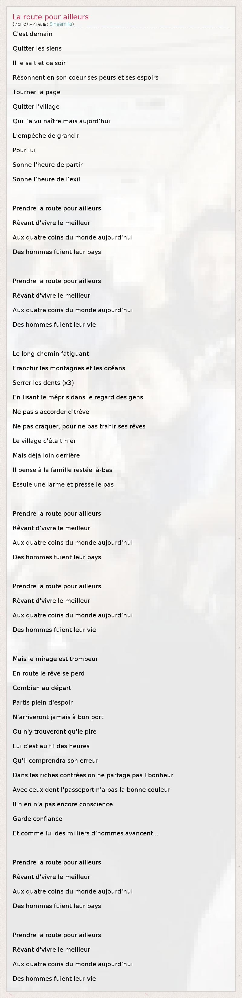 C'est demain Quitter les siens Il le sait et ce soir Résonnent en son coeur ses peurs et ses espoirs Tourner la page Quitter l'village Qui l'a vu naître mais aujord'hui L'empêche de grandir Pour lui Sonne l'heure de partir Sonne l'heure de l'exil Prendre la route pour ailleurs Rêvant d'vivre le meilleur Aux quatre coins du monde aujourd'hui Des hommes fuient leur pays Prendre la route pour ailleurs Rêvant d'vivre le meilleur Aux quatre coins du monde aujourd'hui Des hommes fuient leur vie Le long chemin fatiguant Franchir les montagnes et les océans Serrer les dents (x3) En lisant le mépris dans le regard des gens Ne pas s'accorder d'trêve Ne pas craquer, pour ne pas trahir ses rêves Le village c'était hier Mais déjà loin derrière Il pense à la famille restée là-bas Essuie une larme et presse le pas Prendre la route pour ailleurs Rêvant d'vivre le meilleur Aux quatre coins du monde aujourd'hui Des hommes fuient leur pays Prendre la route pour ailleurs Rêvant d'vivre le meilleur Aux quatre coins du monde aujourd'hui Des hommes fuient leur vie Mais le mirage est trompeur En route le rêve se perd Combien au départ Partis plein d'espoir N'arriveront jamais à bon port Ou n'y trouveront qu'le pire Lui c'est au fil des heures Qu'il comprendra son erreur Dans les riches contrées on ne partage pas l'bonheur Avec ceux dont l'passeport n'a pas la bonne couleur Il n'en n'a pas encore conscience Garde confiance Et comme lui des milliers d'hommes avancent... Prendre la route pour ailleurs Rêvant d'vivre le meilleur Aux quatre coins du monde aujourd'hui Des hommes fuient leur pays Prendre la route pour ailleurs Rêvant d'vivre le meilleur Aux quatre coins du monde aujourd'hui Des hommes fuient leur vie