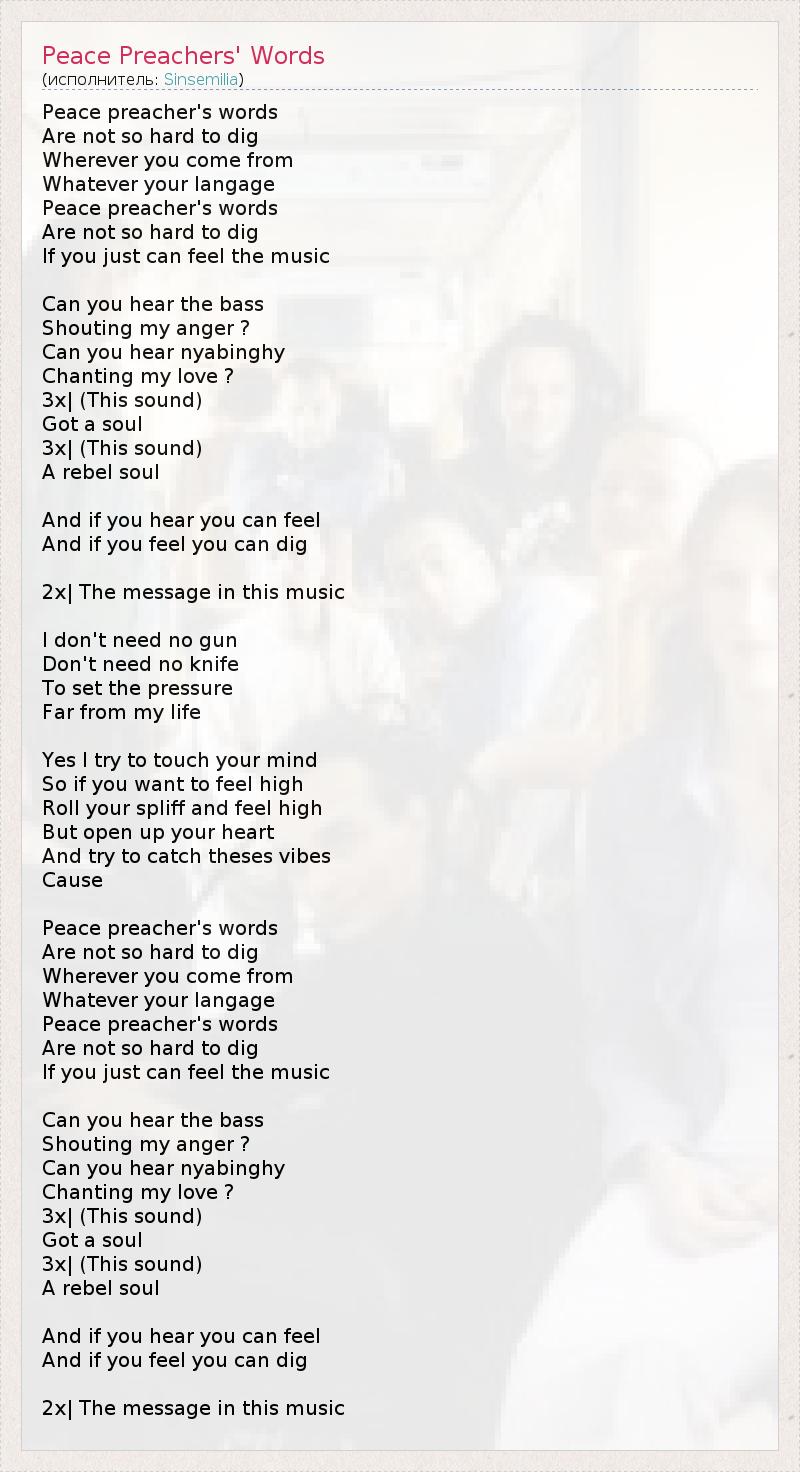 ГлавнаяИсполнителиSinsemiliaPeace Preachers' Words