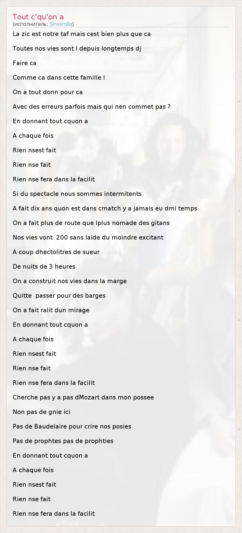А как ты думаешь, о чем песня "Tout c'qu'on a" ?