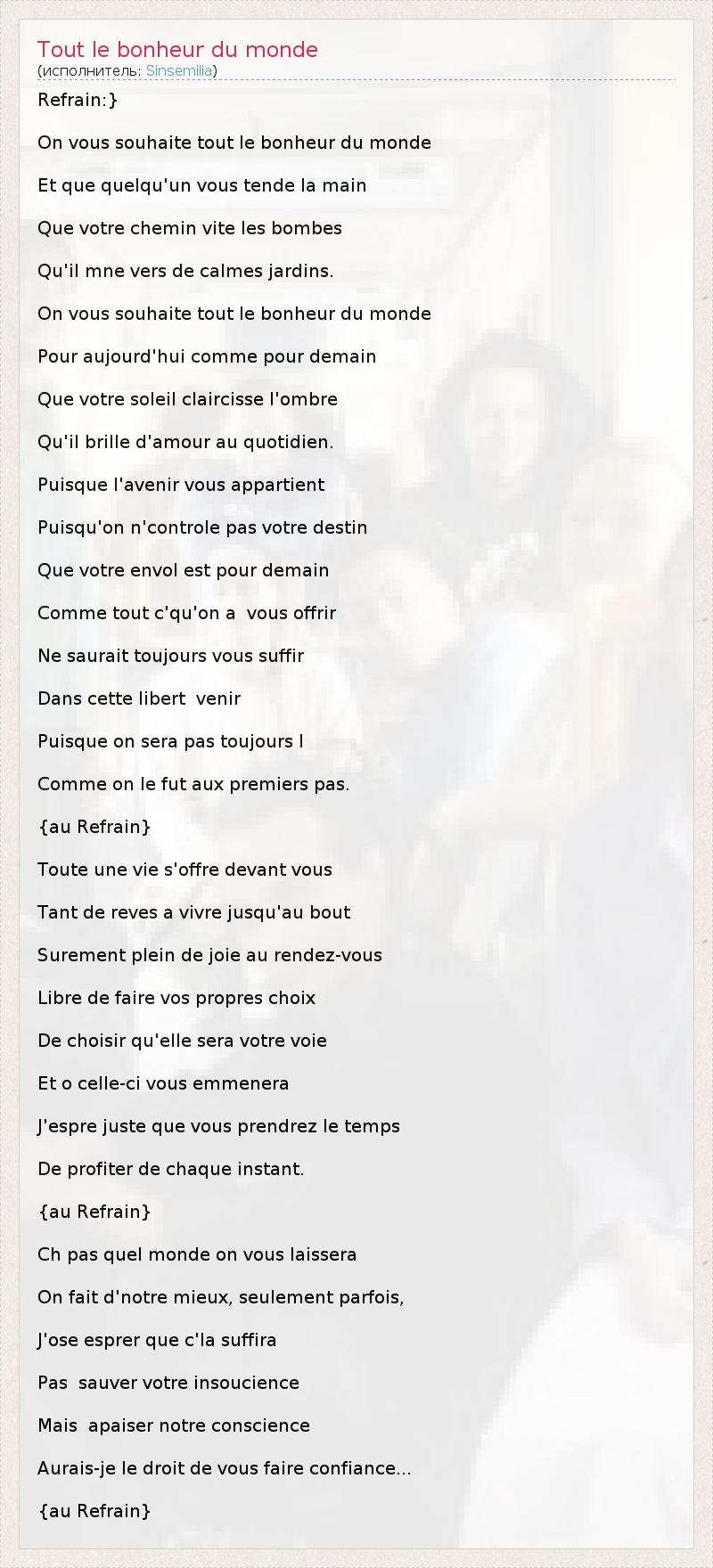 А как ты думаешь, о чем песня "Tout le bonheur du monde" ?
