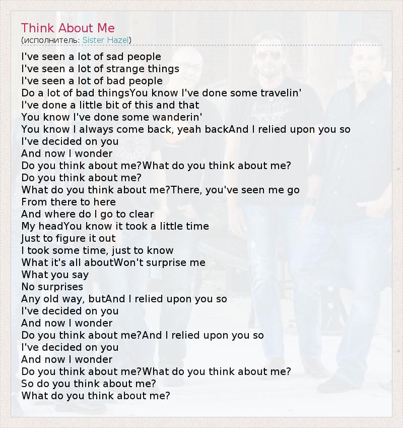 I've seen a lot of sad people I've seen a lot of strange things I've seen a lot of bad people Do a lot of bad thingsYou know I've done some travelin' I've done a little bit of this and that You know I've done some wanderin' You know I always come back, yeah backAnd I relied upon you so I've decided on you And now I wonder Do you think about me?What do you think about me? Do you think about me? What do you think about me?There, you've seen me go From there to here And where do I go to clear My headYou know it took a little time Just to figure it out I took some time, just to know What it's all aboutWon't surprise me What you say No surprises Any old way, butAnd I relied upon you so I've decided on you And now I wonder Do you think about me?And I relied upon you so I've decided on you And now I wonder Do you think about me?What do you think about me? So do you think about me? What do you think about me?