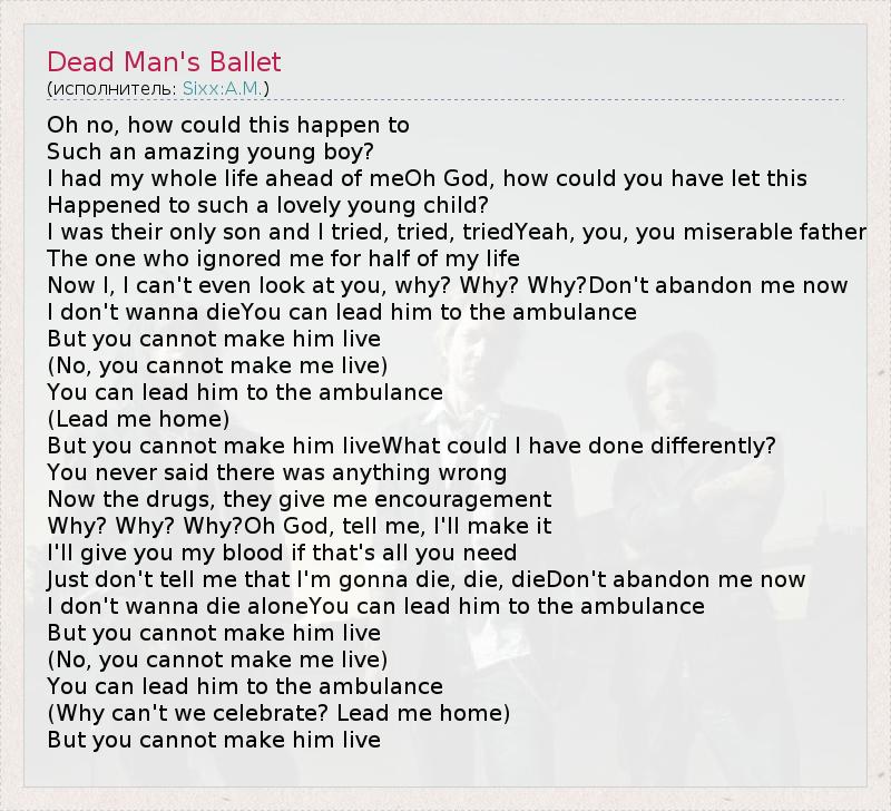 Oh no, how could this happen to Such an amazing young boy? I had my whole life ahead of meOh God, how could you have let this Happened to such a lovely young child? I was their only son and I tried, tried, triedYeah, you, you miserable father The one who ignored me for half of my life Now I, I can't even look at you, why? Why? Why?Don't abandon me now I don't wanna dieYou can lead him to the ambulance But you cannot make him live (No, you cannot make me live) You can lead him to the ambulance (Lead me home) But you cannot make him liveWhat could I have done differently? You never said there was anything wrong Now the drugs, they give me encouragement Why? Why? Why?Oh God, tell me, I'll make it I'll give you my blood if that's all you need Just don't tell me that I'm gonna die, die, dieDon't abandon me now I don't wanna die aloneYou can lead him to the ambulance But you cannot make him live (No, you cannot make me live) You can lead him to the ambulance (Why can't we celebrate? Lead me home) But you cannot make him live