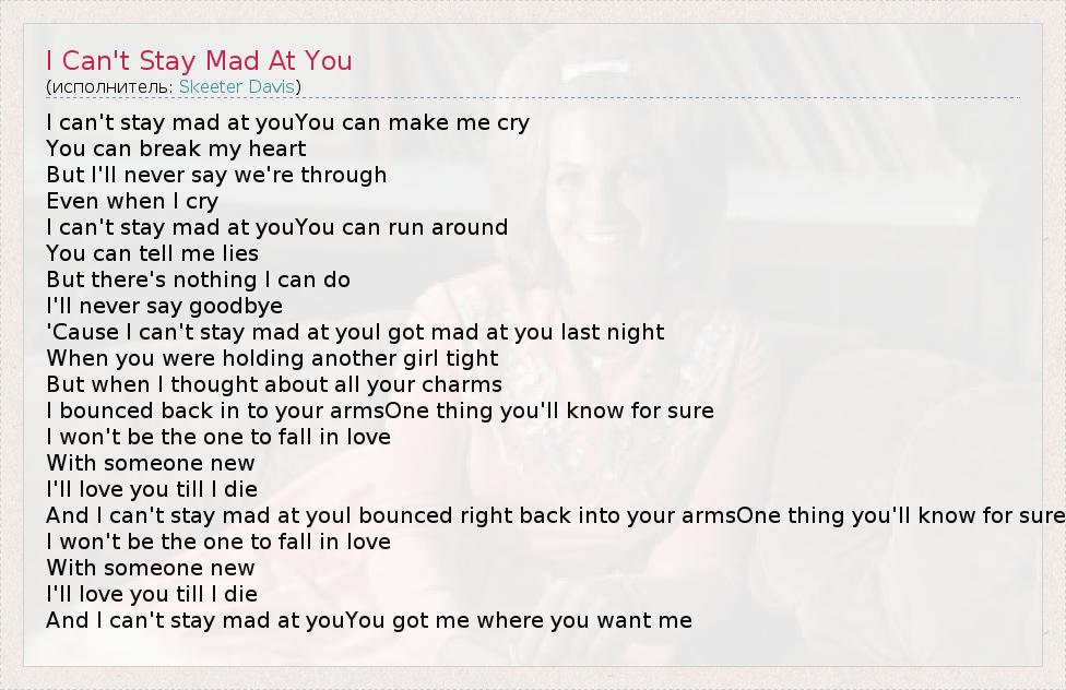 А как ты думаешь, о чем песня "I Can't Stay Mad At You" ?