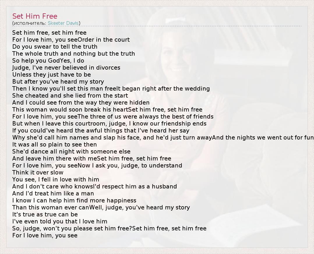 Set him free, set him free For I love him, you seeOrder in the court Do you swear to tell the truth The whole truth and nothing but the truth So help you GodYes, I do Judge, I've never believed in divorces Unless they just have to be But after you've heard my story Then I know you'll set this man freeIt began right after the wedding She cheated and she lied from the start And I could see from the way they were hidden This woman would soon break his heartSet him free, set him free For I love him, you seeThe three of us were always the best of friends But when I leave this courtroom, judge, I know our friendship ends If you could've heard the awful things that I've heard her say Why she'd call him names and slap his face, and he'd just turn awayAnd the nights we went out for fun It was all so plain to see then She'd dance all night with someone else And leave him there with meSet him free, set him free For I love him, you seeNow I ask you, judge, to understand Think it over slow You see, I fell in love with him And I don't care who knowsI'd respect him as a husband And I'd treat him like a man I know I can help him find more happiness Than this woman ever canWell, judge, you've heard my story It's true as true can be I've even told you that I love him So, judge, won't you please set him free?Set him free, set him free For I love him, you see