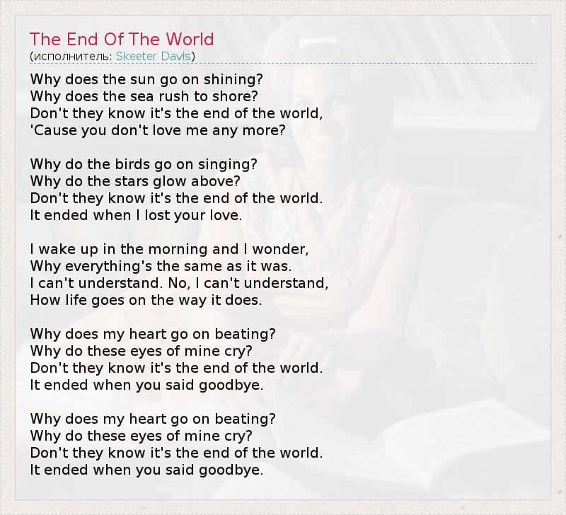 Почему солнце продолжает сиять? Почему море омывает берега? Разве они не знают, что настал конец света, Потому что ты больше не любишь меня? Почему птицы продолжают петь? Почему звёзды сияют над головой? Разве они не знают, что настал конец света, Это случилось, когда я потеряла твою любовь. Я просыпаюсь утром и задаю себе вопрос, Почему всё так же как и прежде. Я не могу понять. Нет, я не могу этого понять, Почему жизнь продолжает идти своим чередом. Почему моё сердце продолжает биться? Почему мои глаза плачут? Разве они не знают, что настал конец света, Это случилось, когда ты сказал "Прощай!" Почему моё сердце продолжает биться? Почему мои глаза плачут? Разве они не знают, что настал конец света, Это случилось, когда ты сказал "Прощай!"